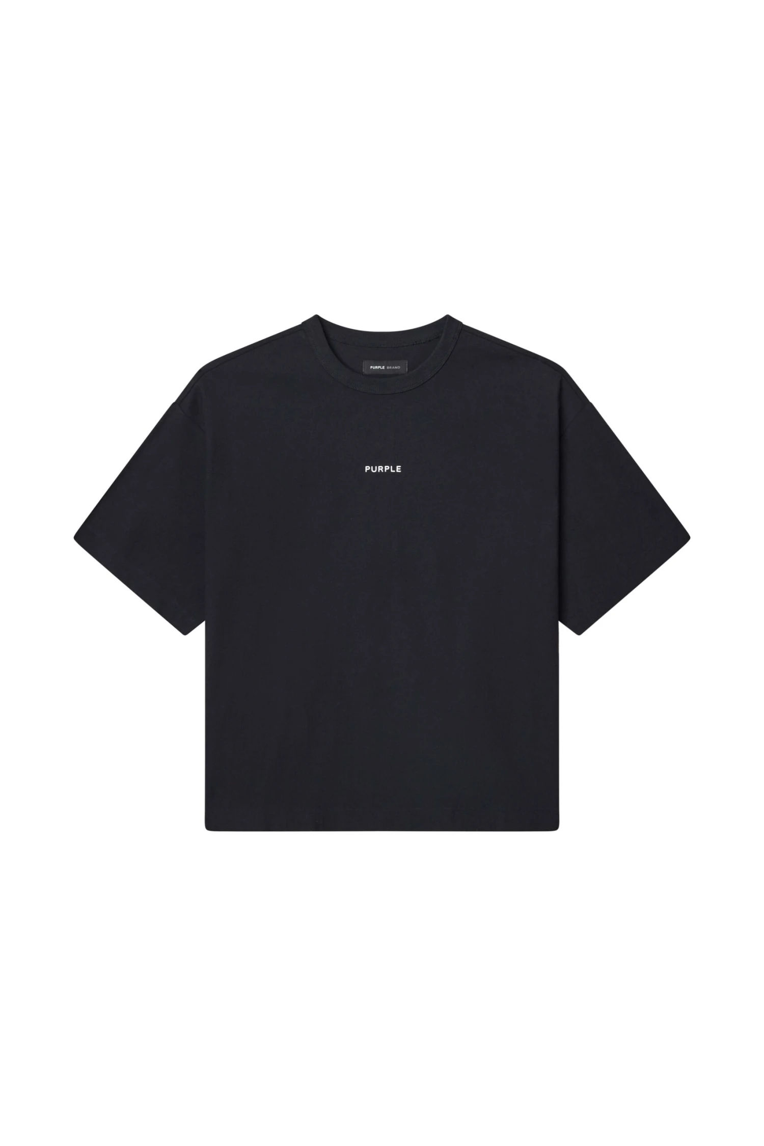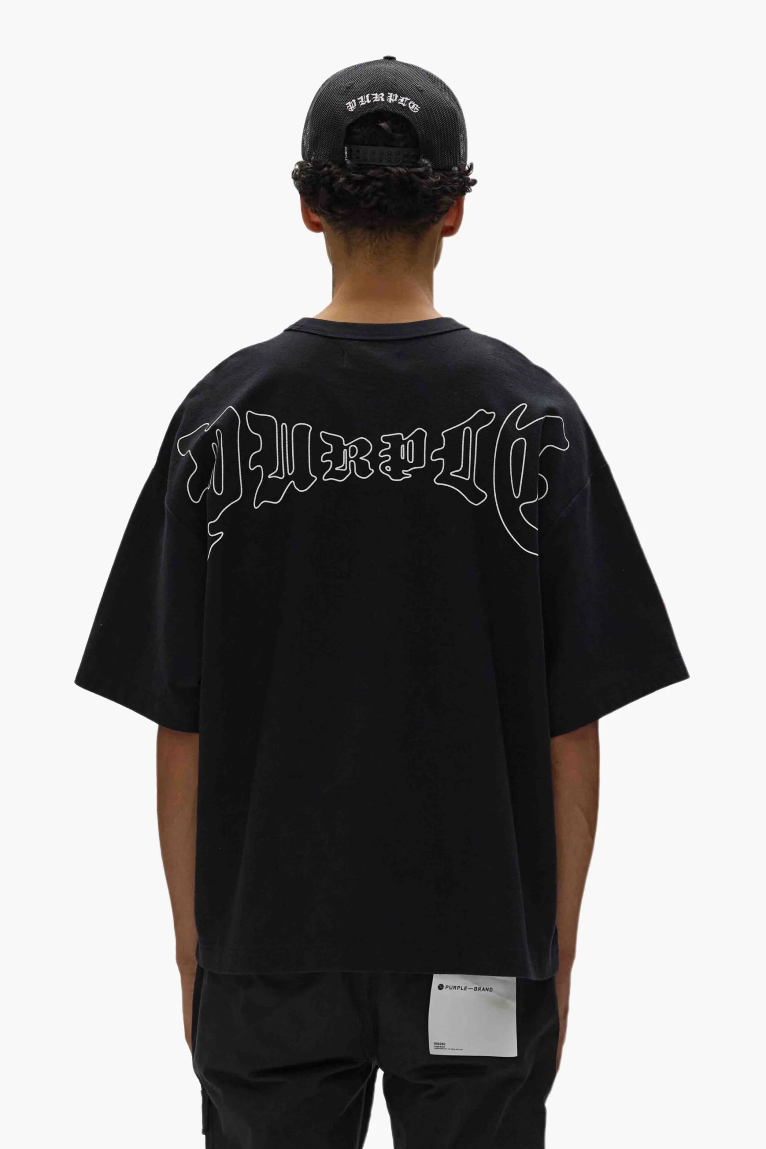 This short-sleeved top is a premium black jersey knit. Featuring Purple Brand logo lettering in front and an arched gothic logo across the shoulders.