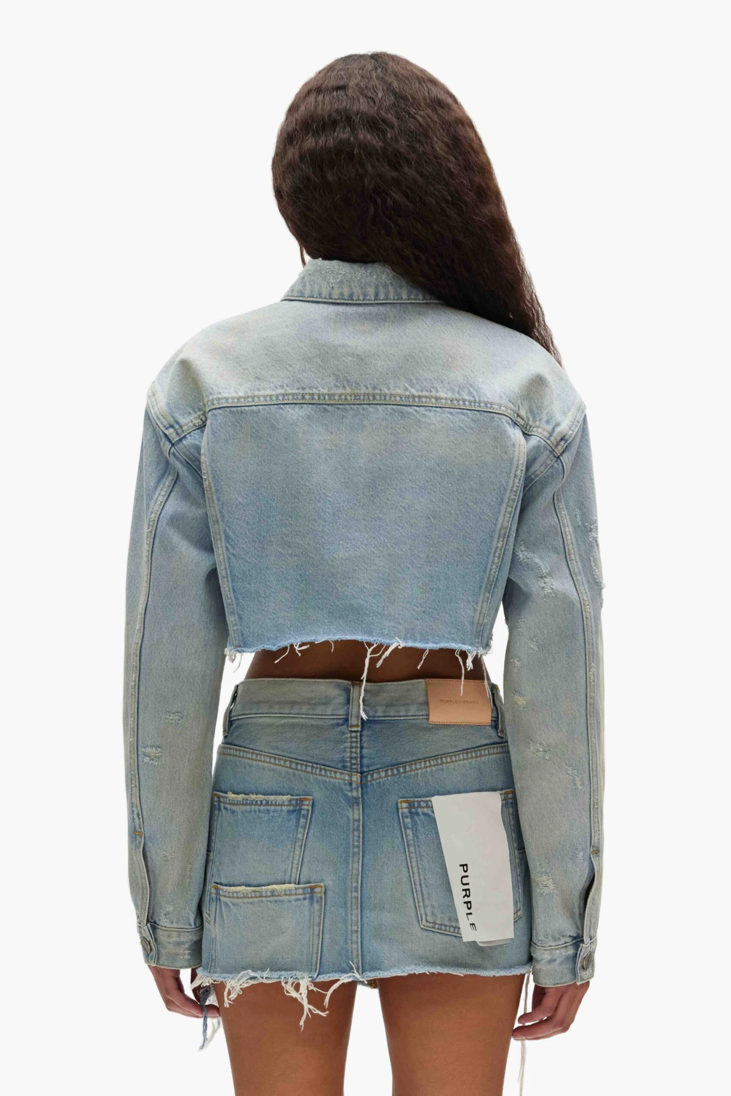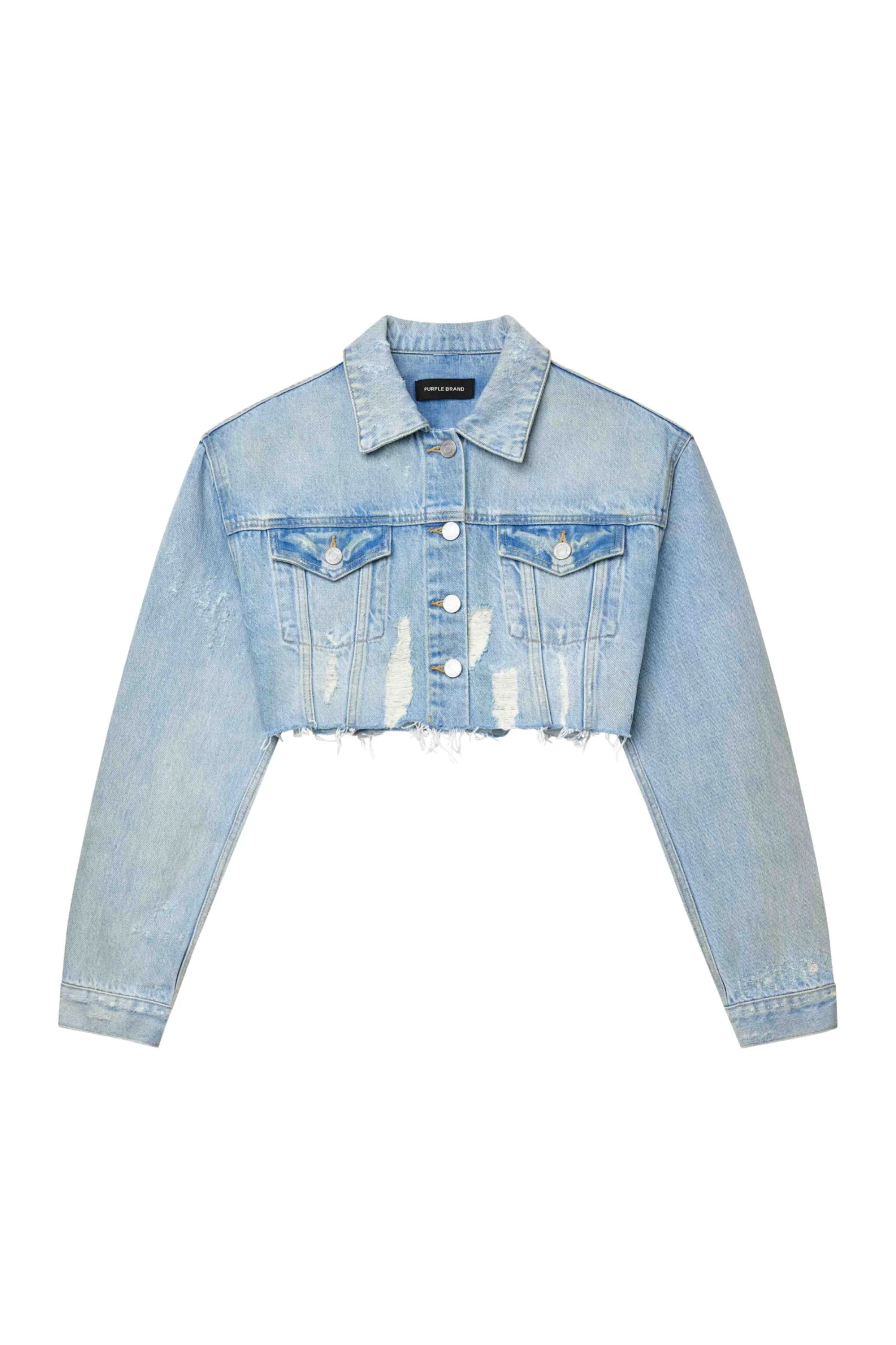 Tailored for a relaxed, cropped fit, this trucker jacket is made premium cotton denim in a light indigo wash. It has front flap pockets and button closures at the placket and cuffs, as well as a cutoff hem that’s been shredded and frayed by hand.