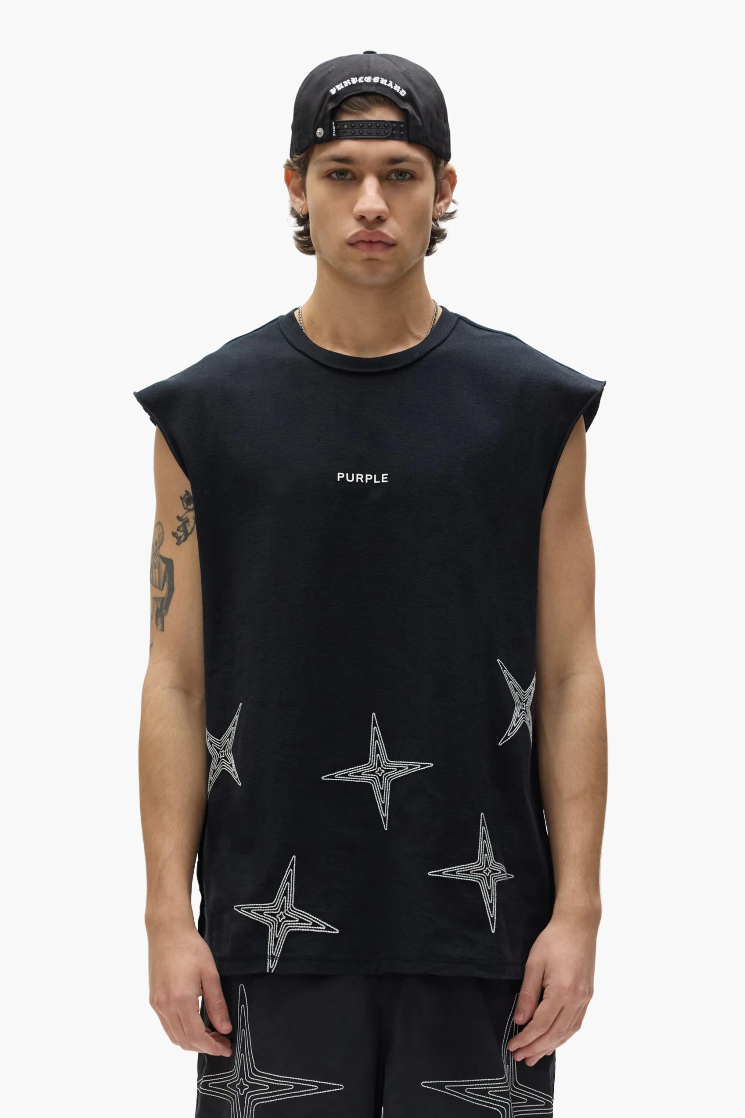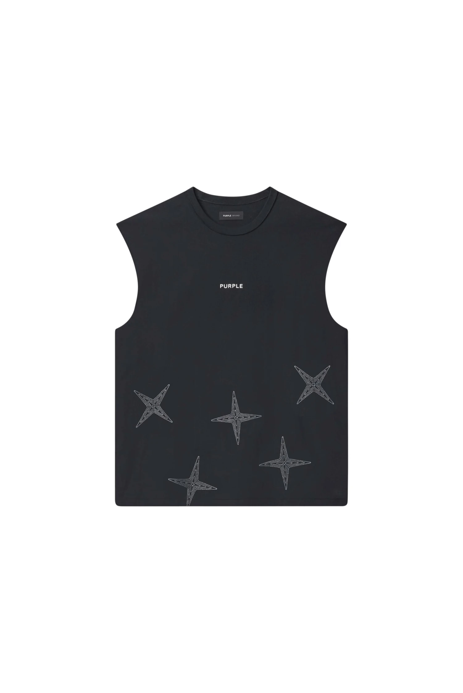Designed for a regular fit, this sleeveless black crewneck tee comes in a textured jersey knit made from 100% cotton. It features Purple brand lettering across the chest with embroidery and a raised matte finish.