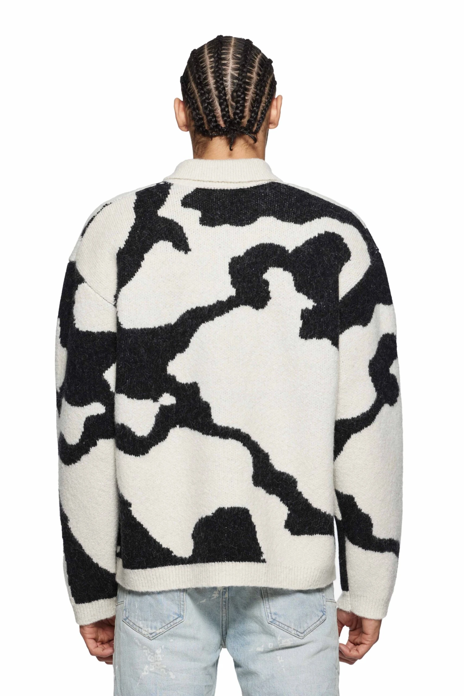 This relaxed pullover is a jacquard wool, alpaca knit featuring a button-up polo collar and contrast car graphic all over with a Purple Brand monogram on the left chest.