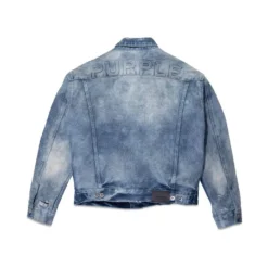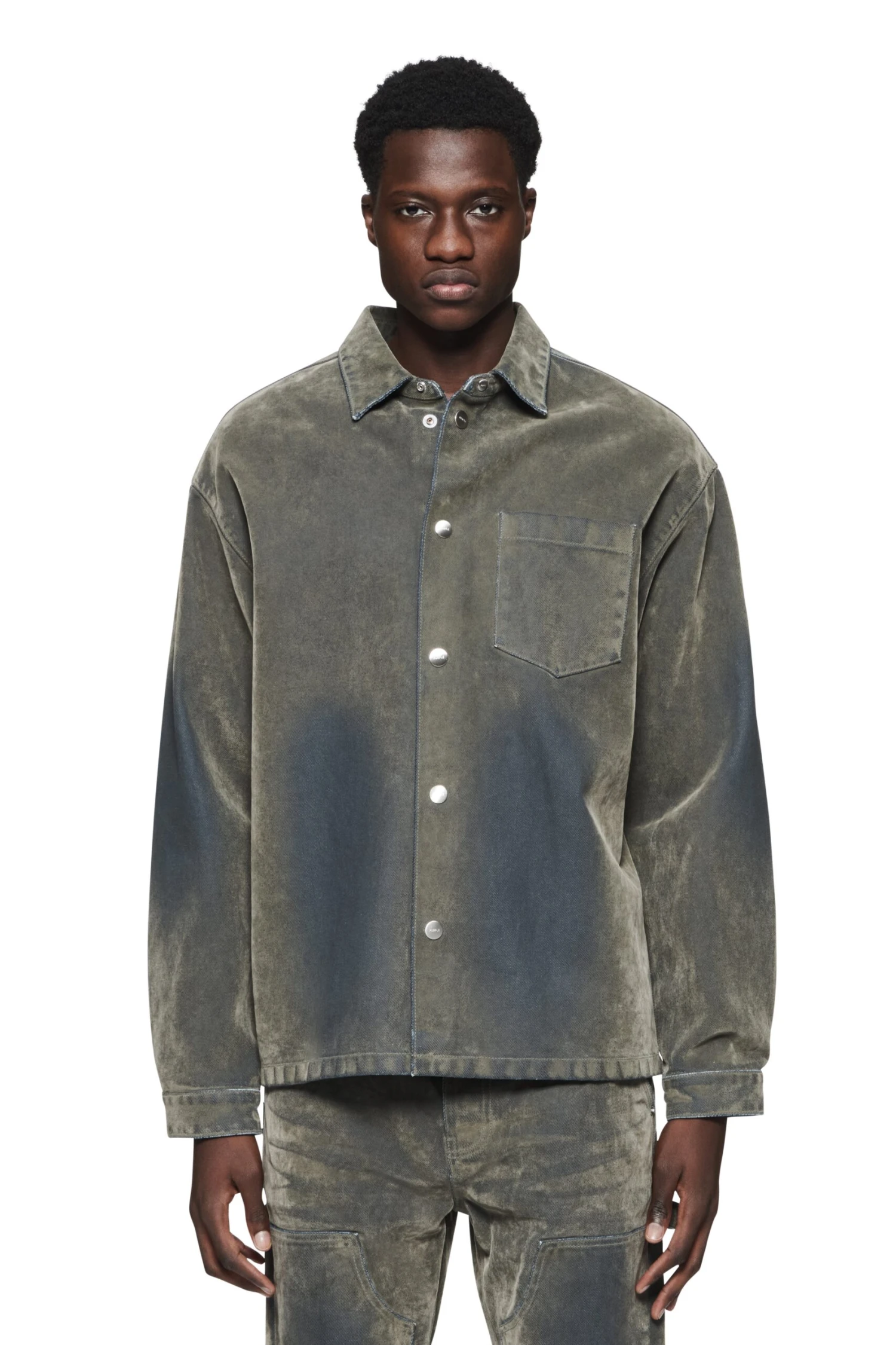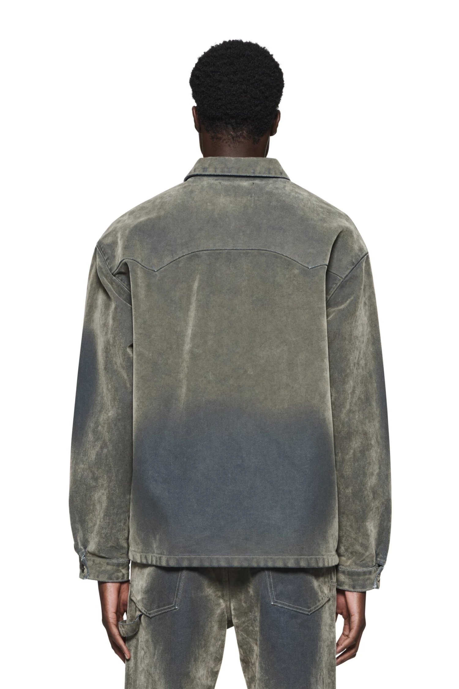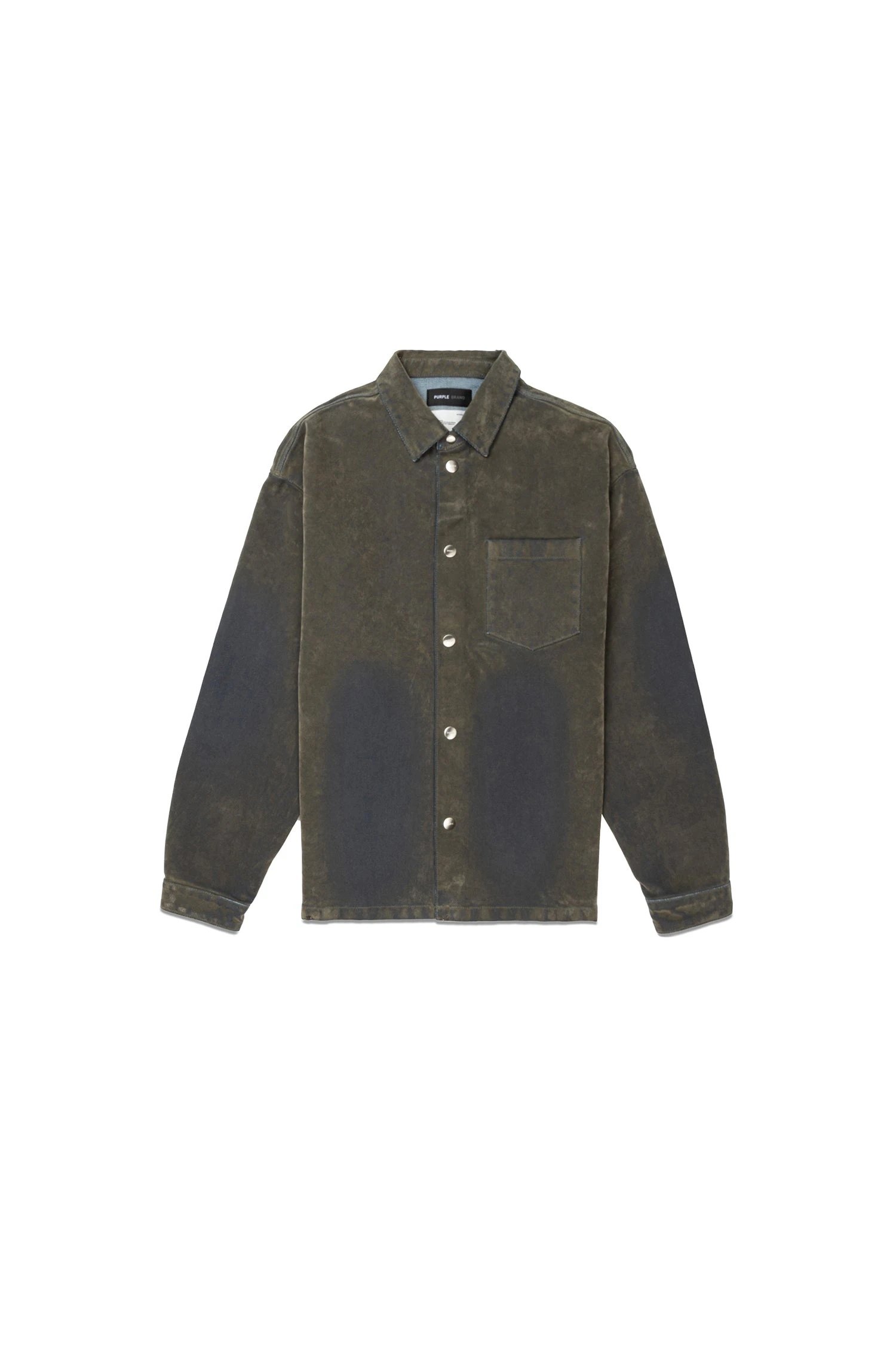 Cut from genuine denim, textured with flocking, this long sleeve shirt jacket is designed to a standard fit with light fading. Detailed with custom brushed silver snaps, a patch pocket, side pockets, and adjustable cuffs.