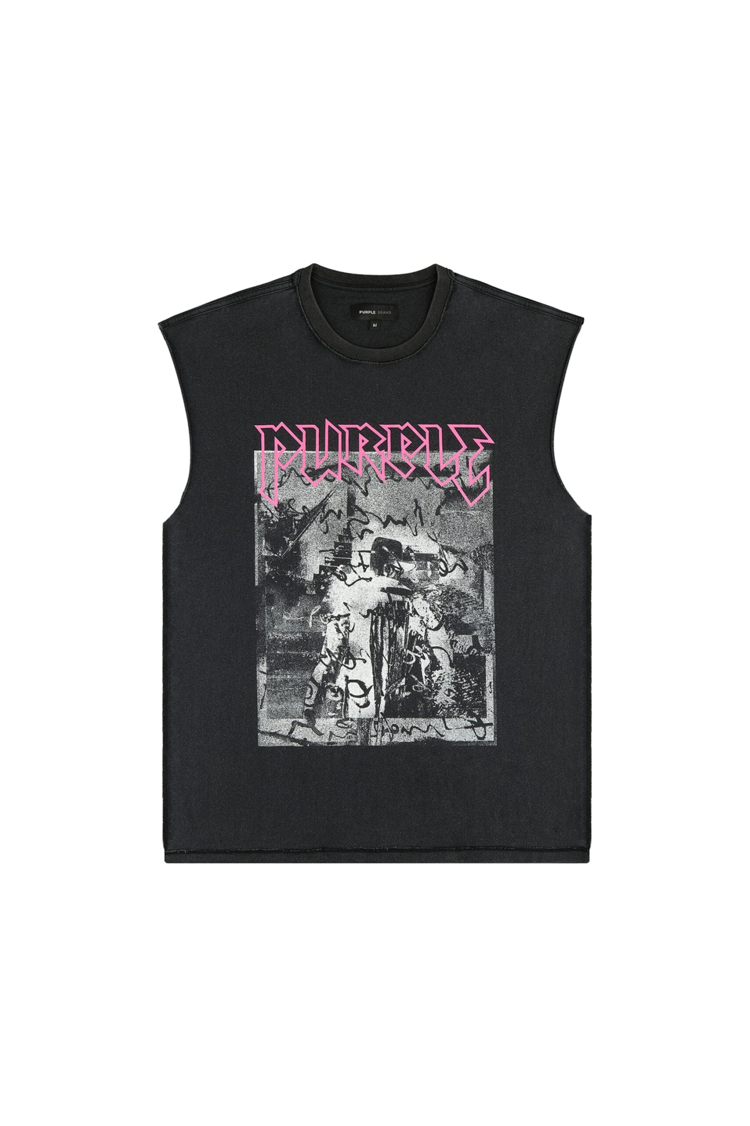 This sleeveless tee is cut from black 100% cotton textured jersey knit. This style features a large digital printed graphic with Purple Brand lettering on the front.