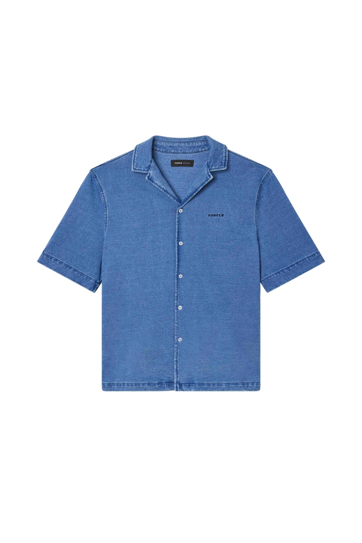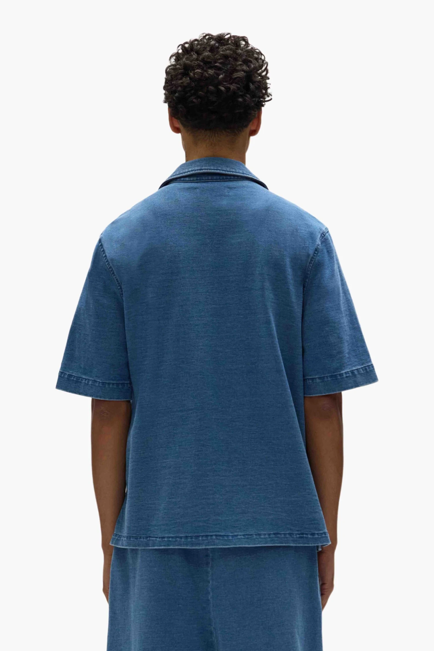 This short sleeve button up is cut from blue knit jersey and features a tuft embroidered logo on the left chest.