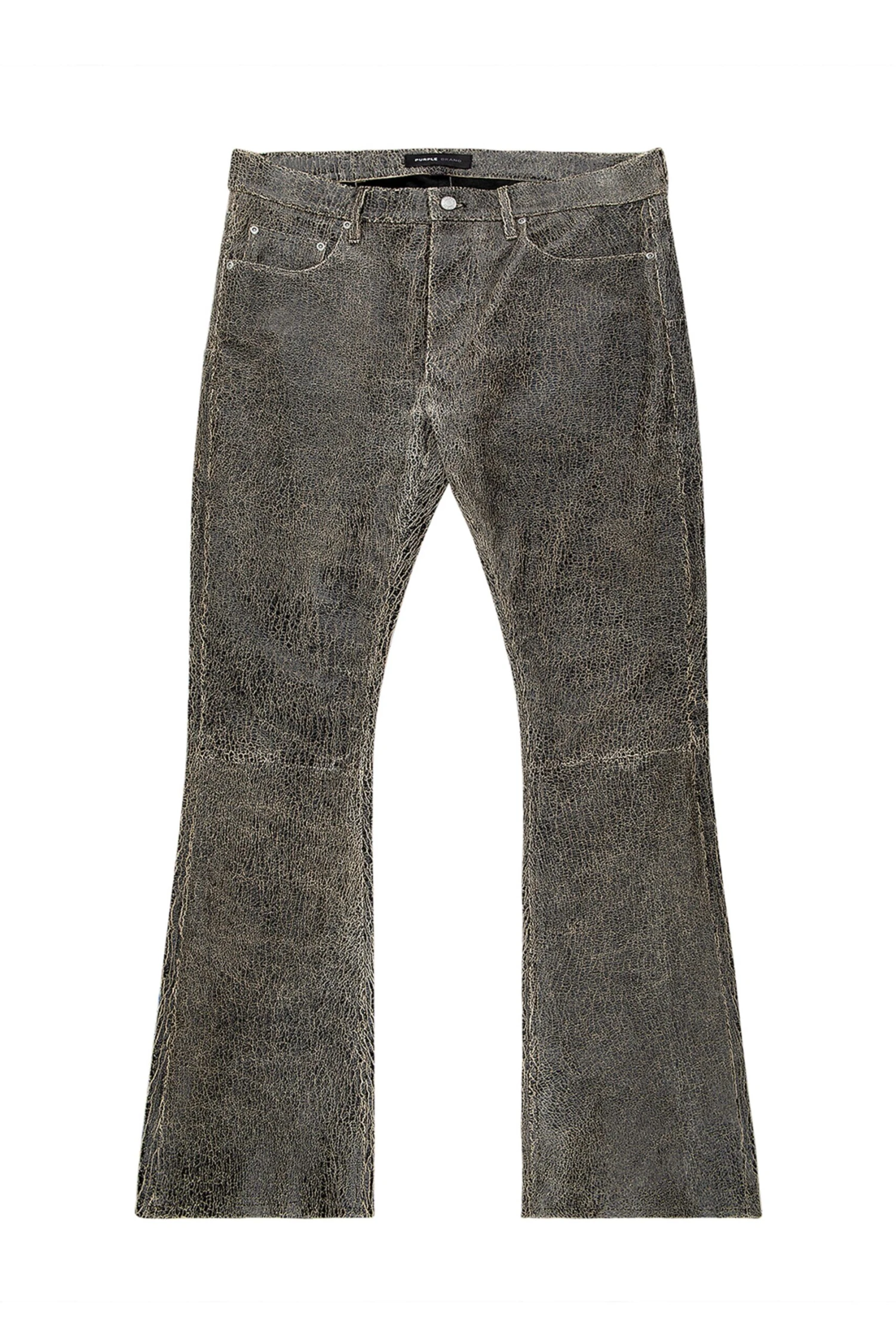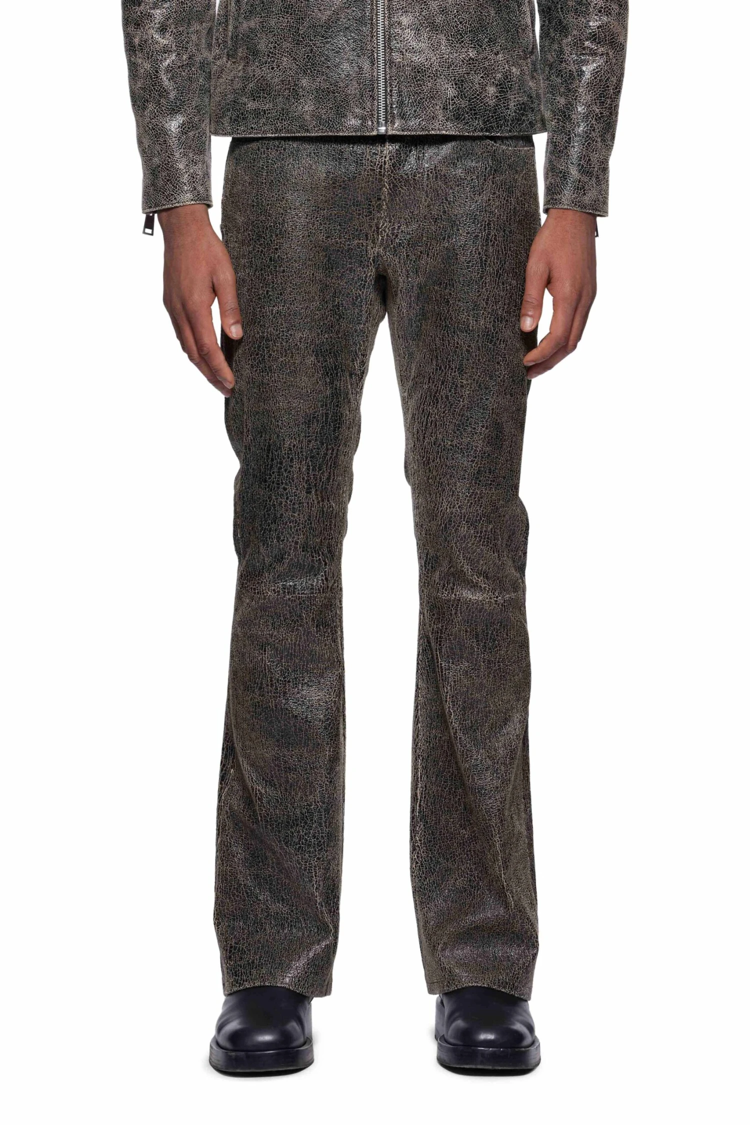 Cut for a slim fit, this leather pant is tailored with belt loops, side pockets and a flared kick-out hem.