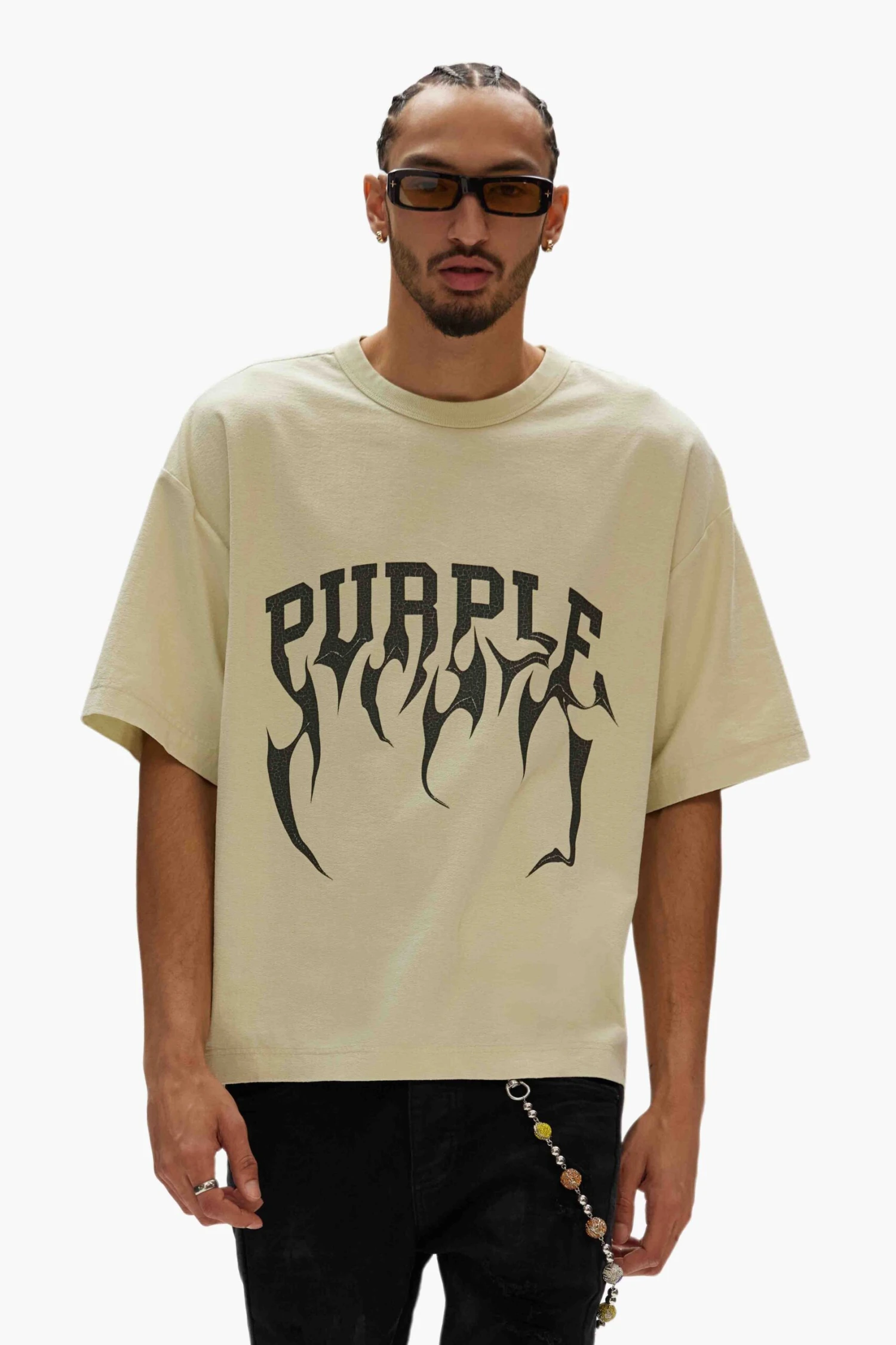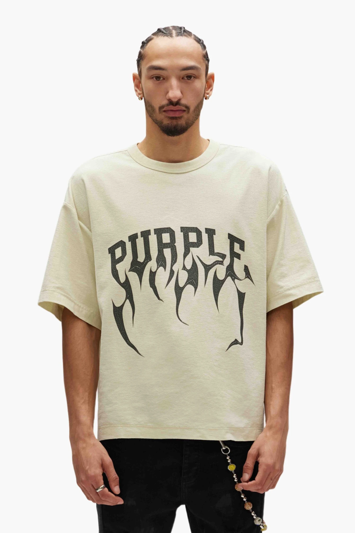 This short sleeved tee is cut from off white 100% cotton textured jersey. This style features a Purple Brand lettering graphic across the chest.