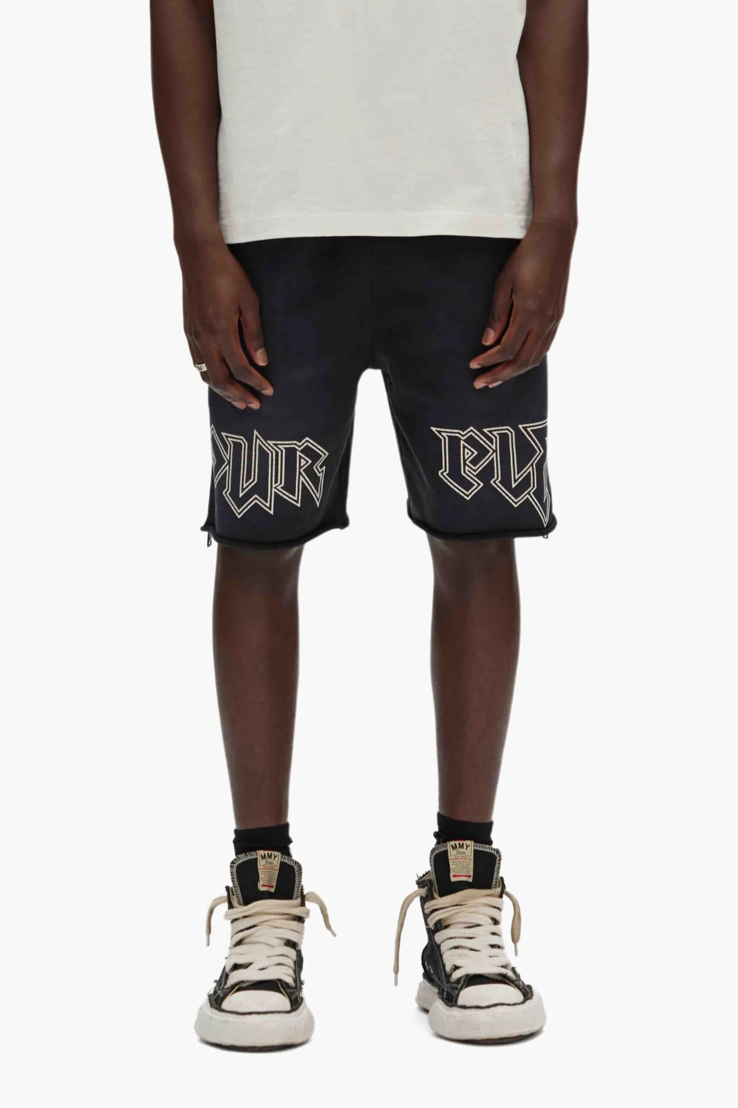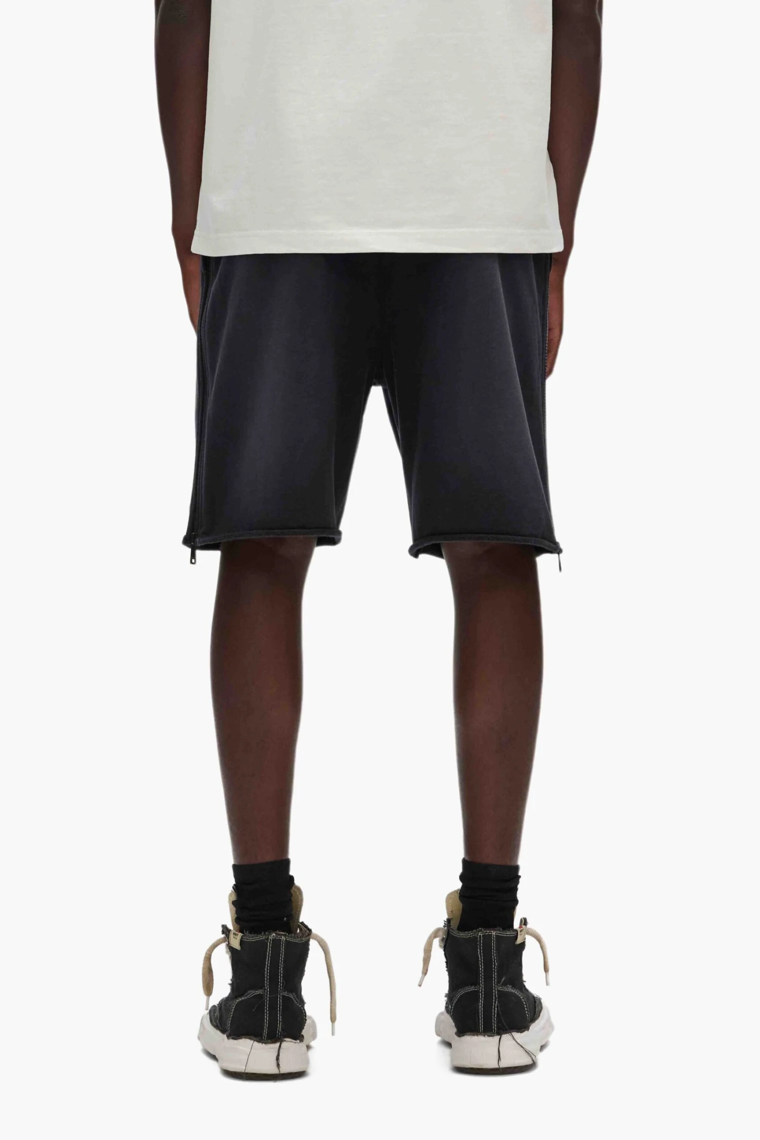 This midweight sweatshort comes in black fleece with a pull-on stretch waist featuring drawcords, side zippers, silicone print and a raw hem.