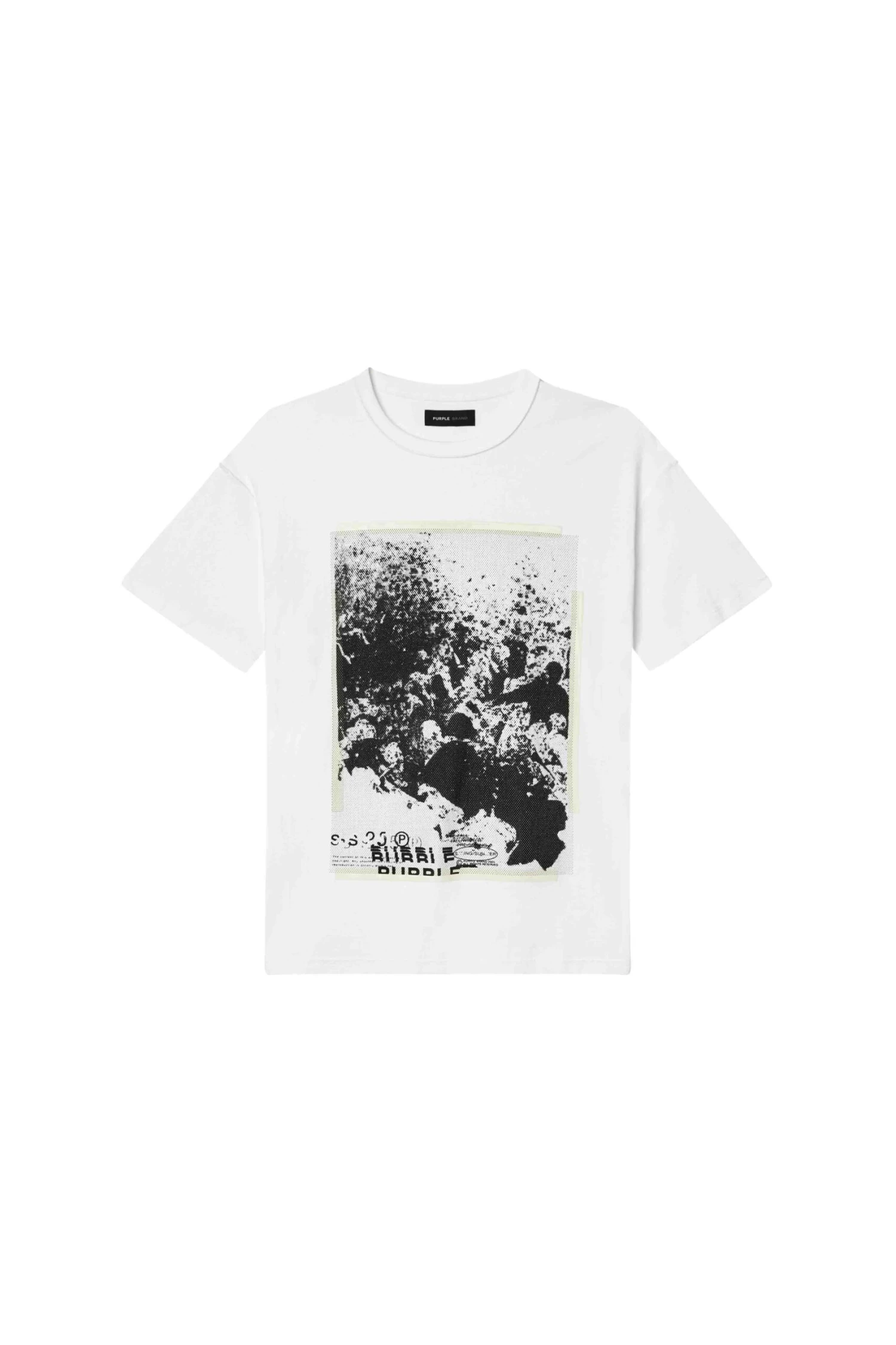Designed for a regular fit, this white crewneck tee comes in a textured jersey knit made from 100% cotton. It features “inside out” seaming and a digital print with a raised, transparent finish.