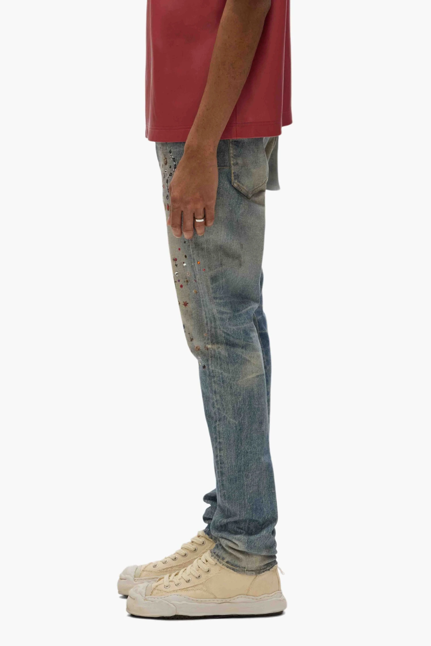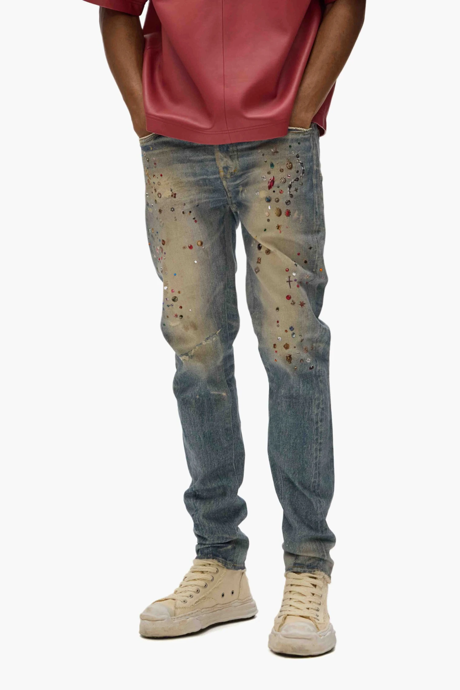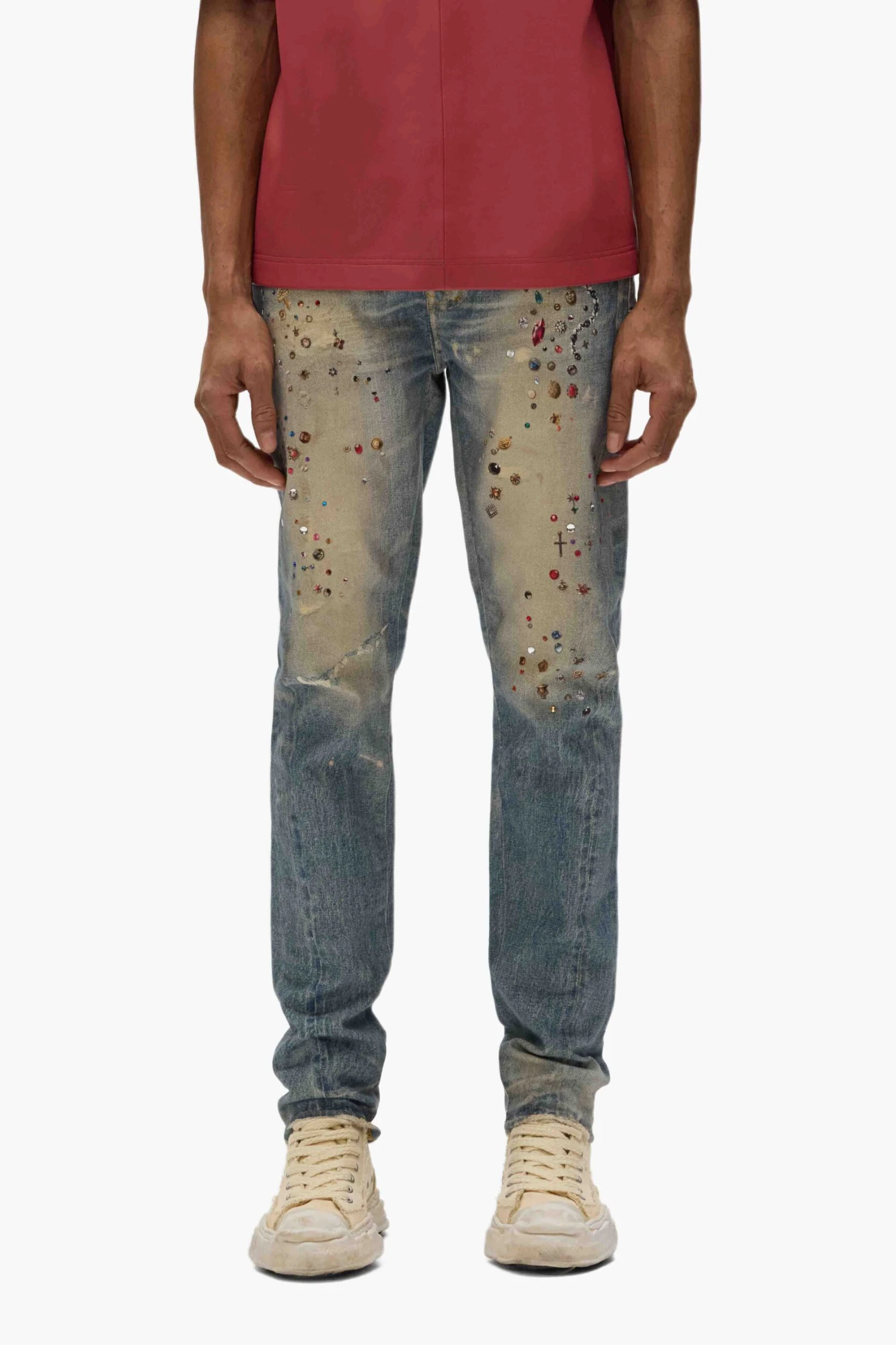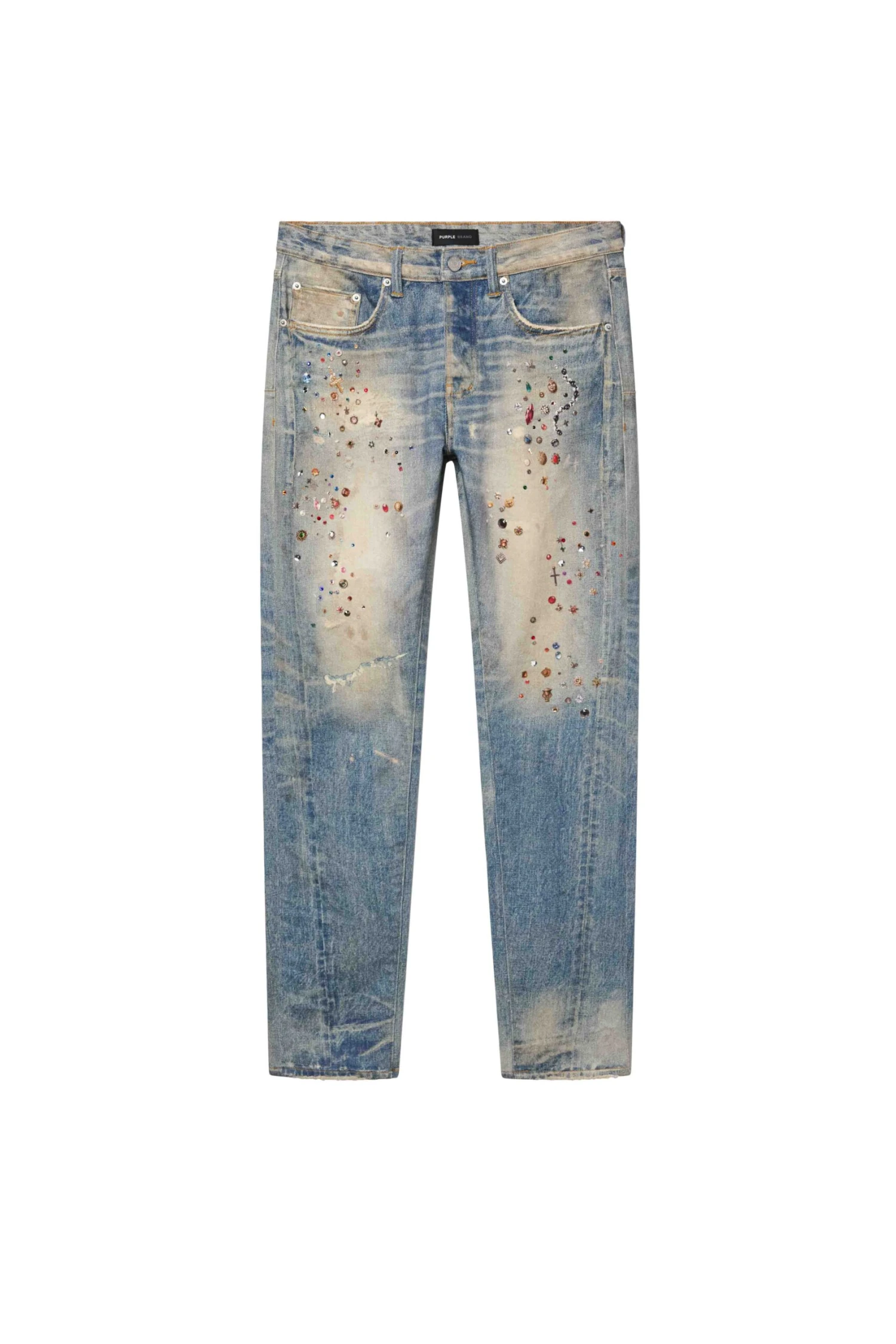 Our P001 is a low-rise skinny men’s jean, crafted from premium stretch denim with classic five-pocket construction that includes a button-fly closure and reinforced belt loops as well as hidden rivets and an inner lining on the back pockets for durability. It’s fitted through the thigh to the ankle for a classic skinny taper, and comes in a light indigo wash, faded by hand and digitally printed with jewels. A custom Purple cowhide leather patch, a back pocket flasher and a logo hangtag lend signature branded finishes.