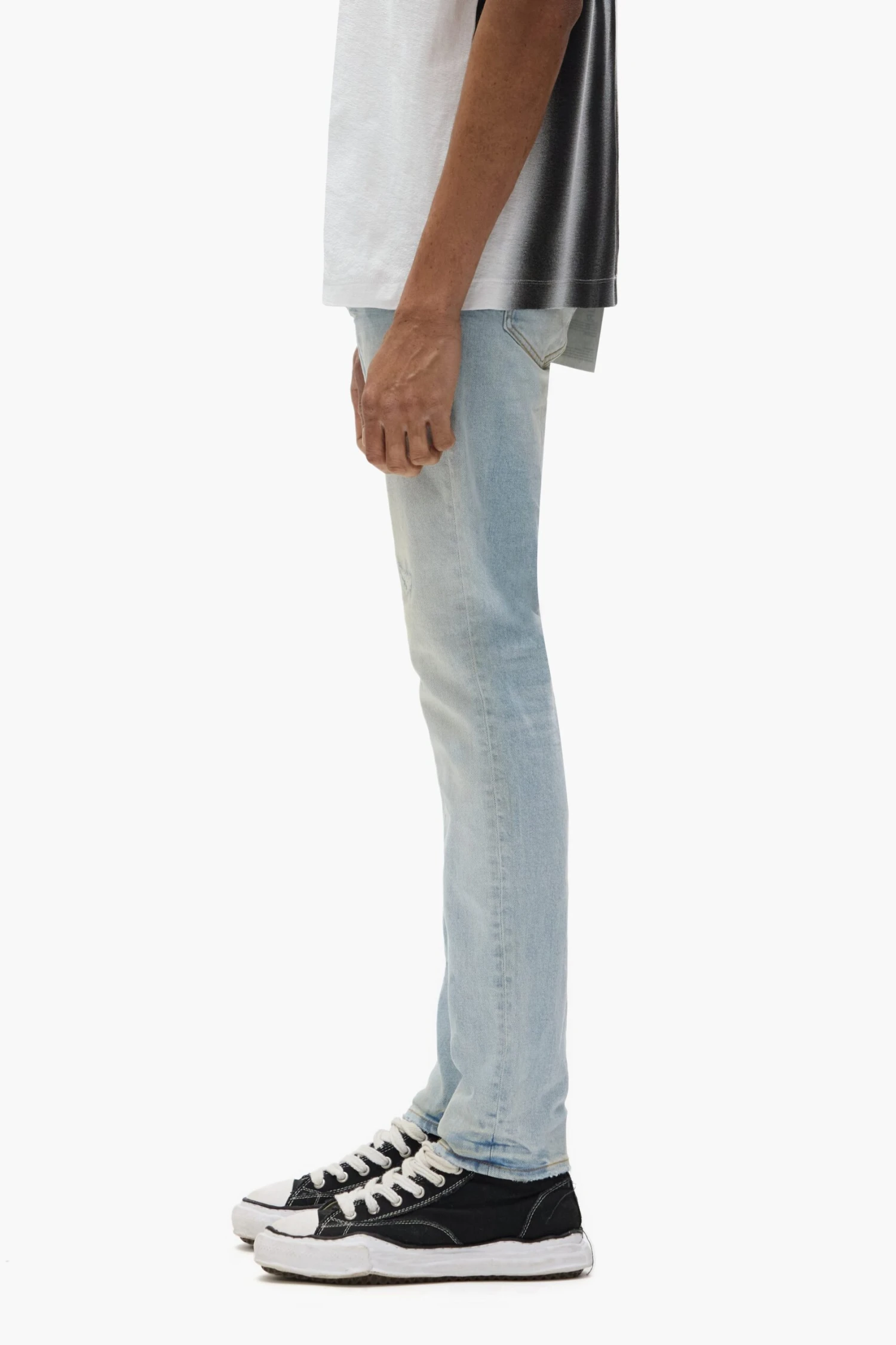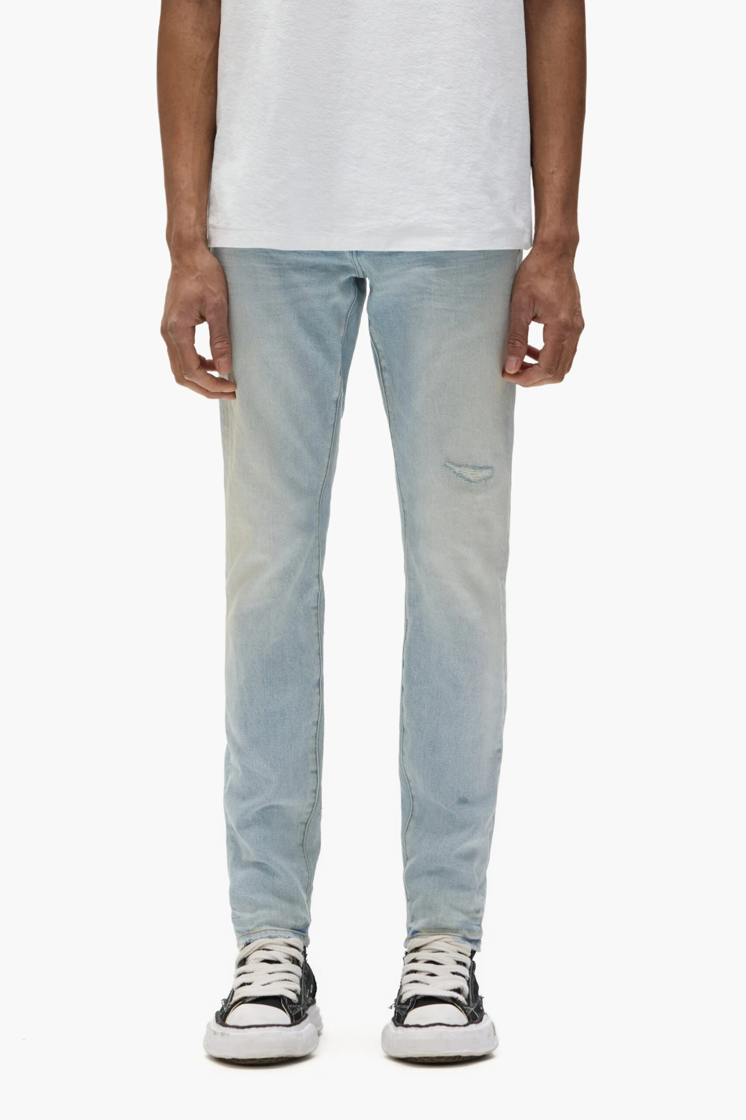 Our P001 is a low-rise men’s jean, crafted from premium stretch denim with classic five-pocket construction that includes a button-fly closure and reinforced belt loops as well as hidden rivets and an inner lining on the back pockets for durability. It’s fitted through the thigh to the ankle for a classic skinny taper, and comes in a light indigo wash, faded and distressed by hand. A custom Purple cowhide leather patch, a back pocket flasher and a logo hangtag lend signature branded finishes.