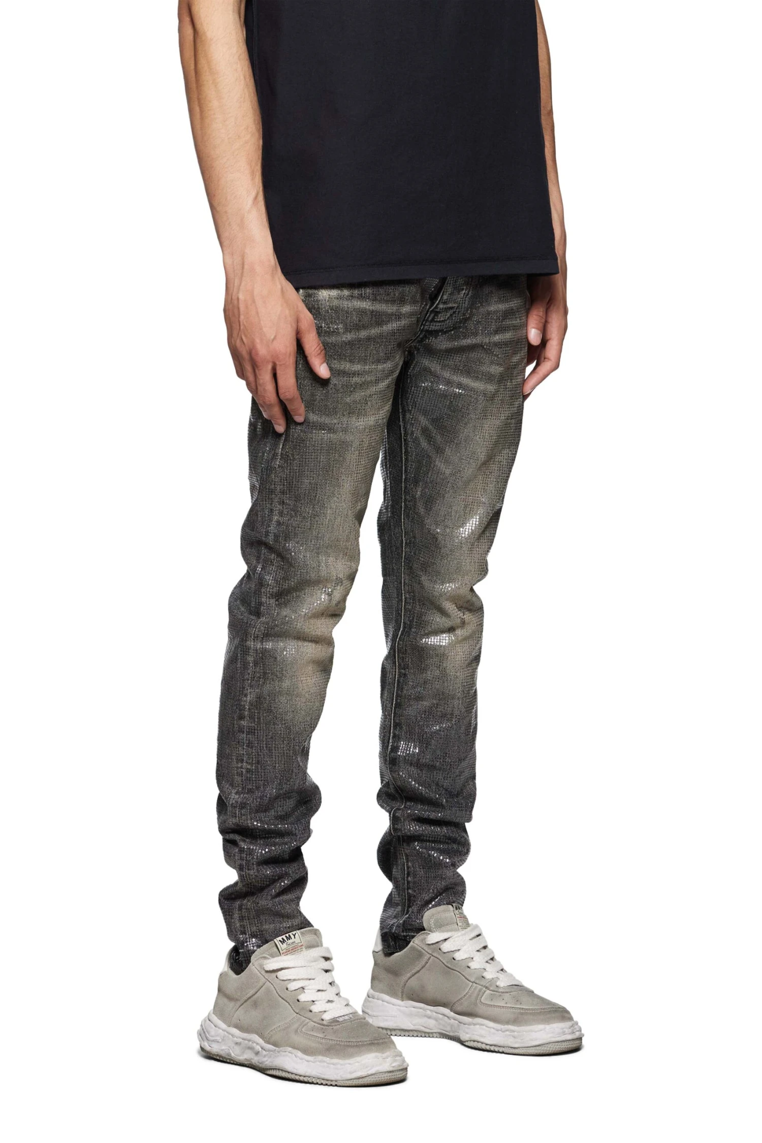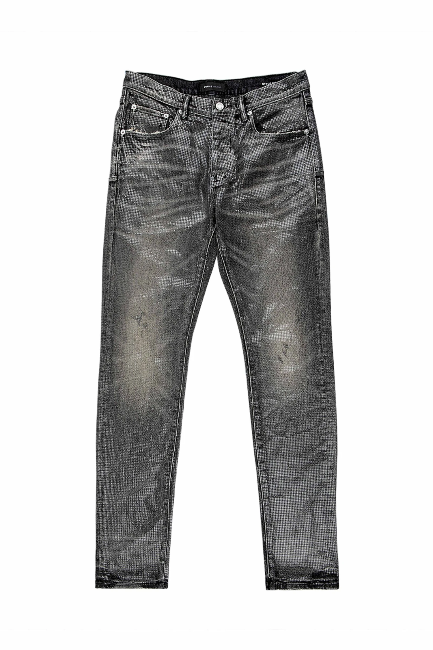 Cut from premium stretch denim in a black wash, this low rise skinny is faded by hand and features a tiled overlay texture throughout the whole garment.