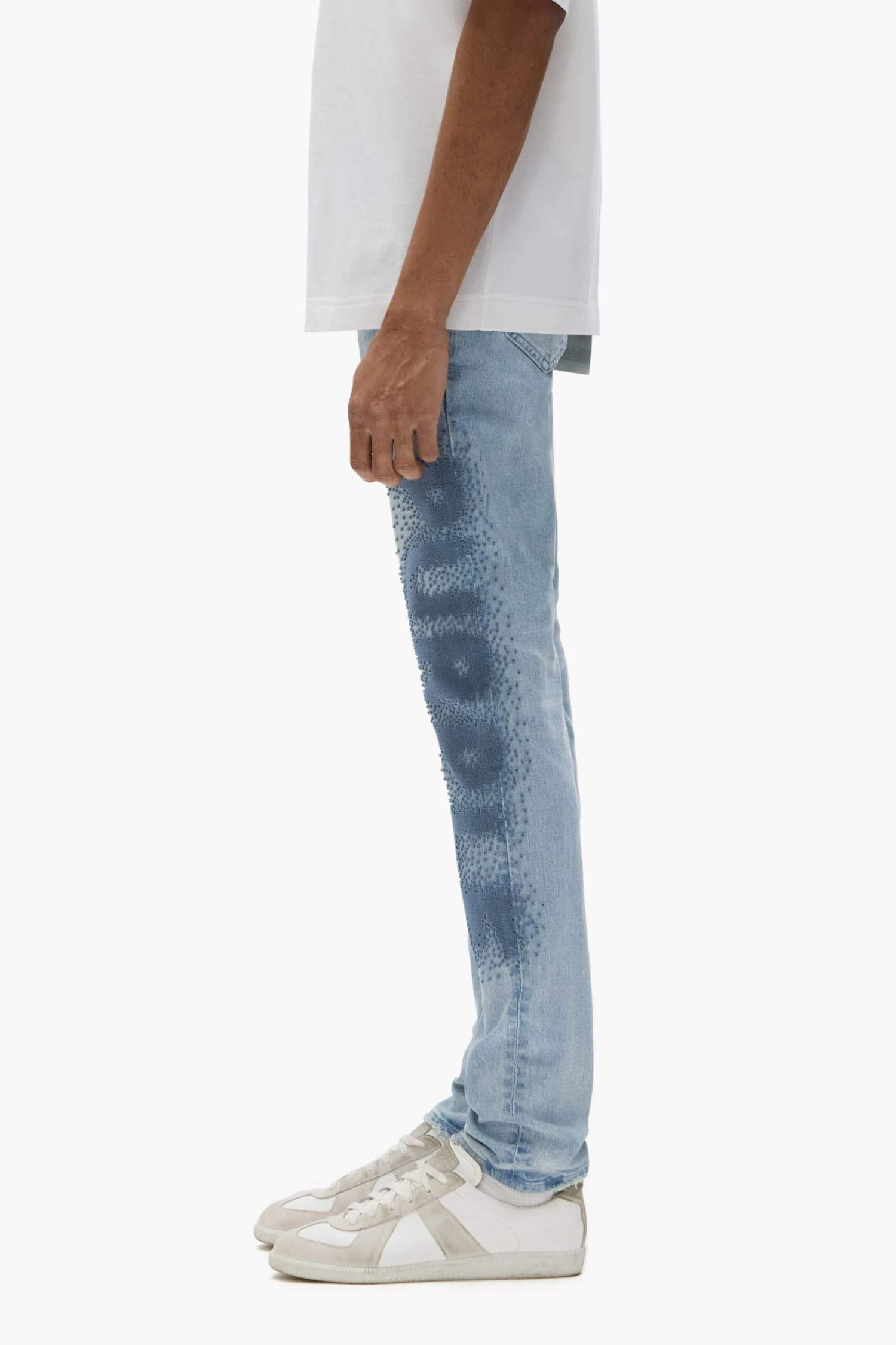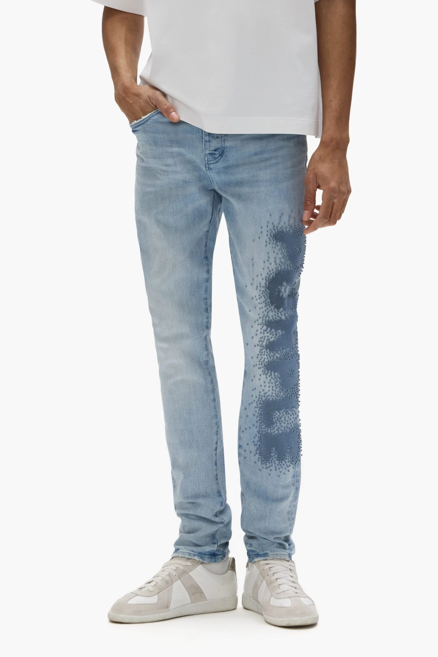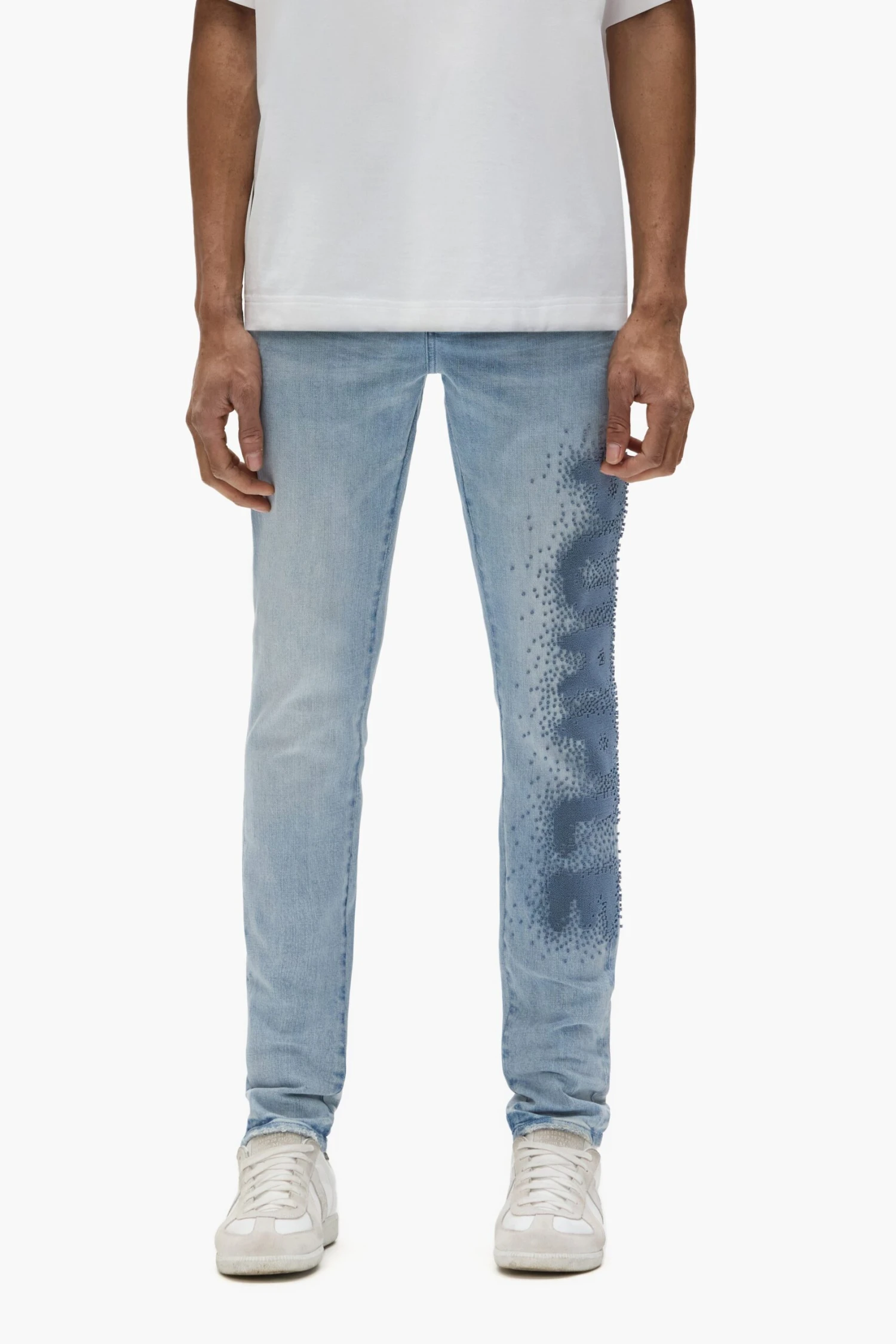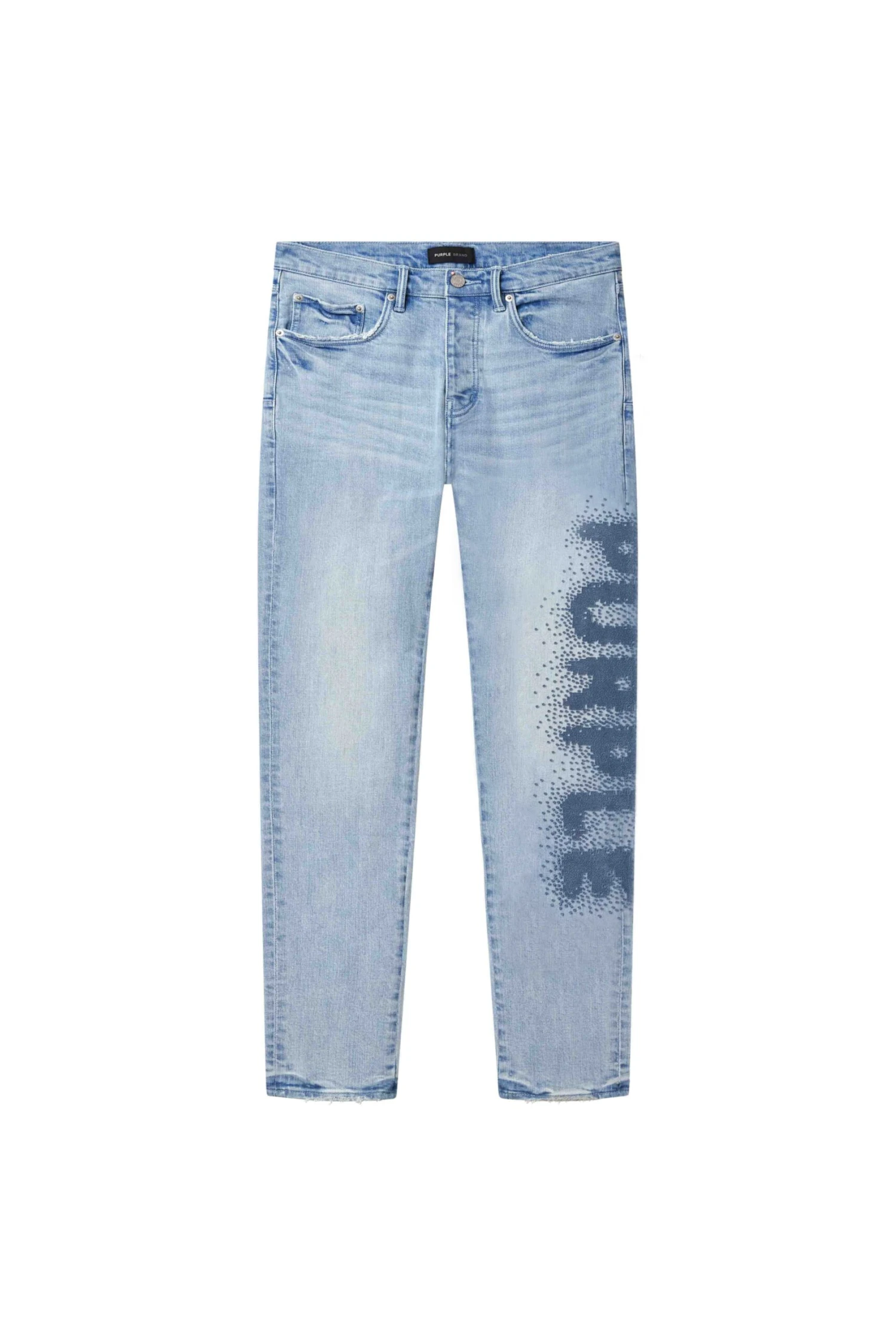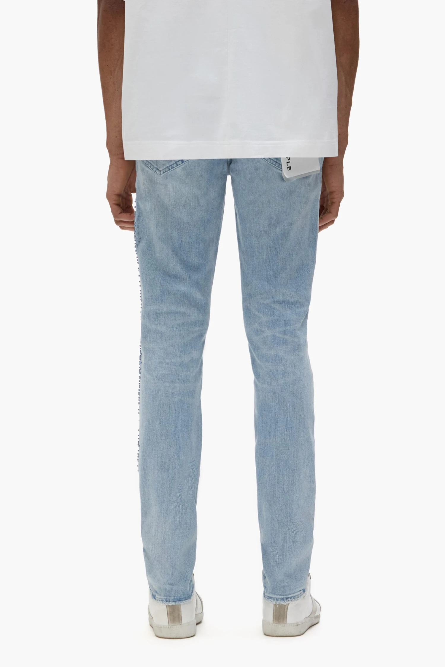 Our P001 is a low-rise men’s jean, crafted from premium stretch denim with classic five-pocket construction that includes a button-fly closure and reinforced belt loops as well as hidden rivets and an inner lining on the back pockets for durability. It’s fitted through the thigh to the ankle for a classic skinny taper, and comes in light indigo wash with pixelated embroidery. A custom Purple cowhide leather patch, a back pocket flasher and a logo hangtag lend signature branded finishes.