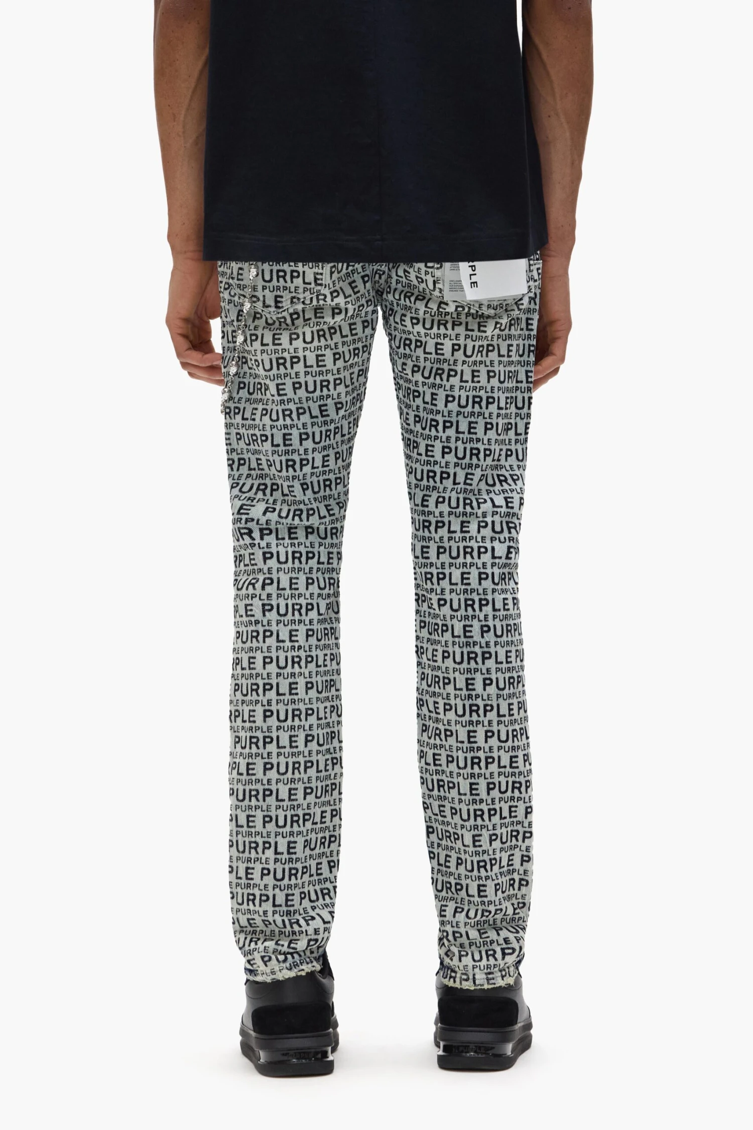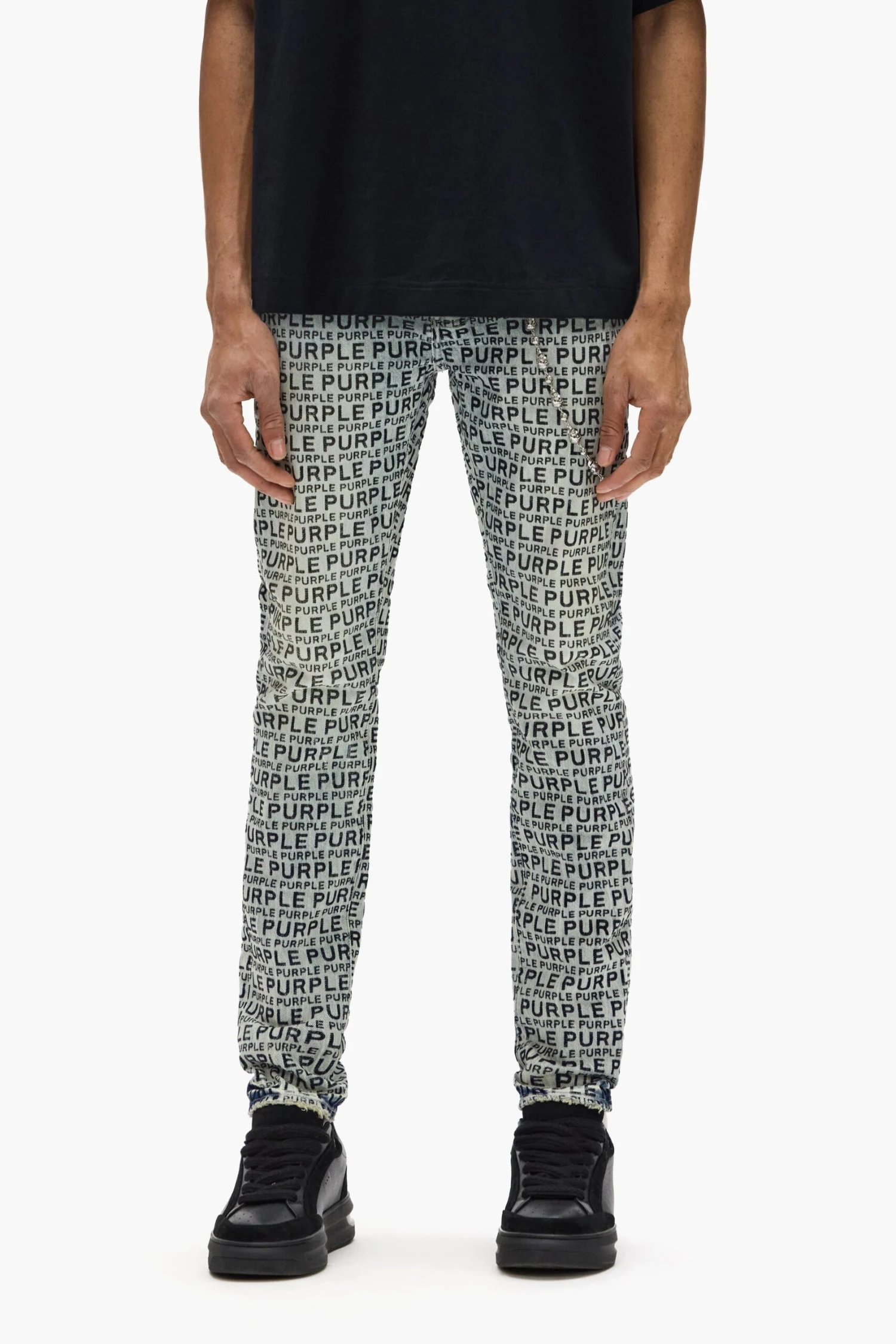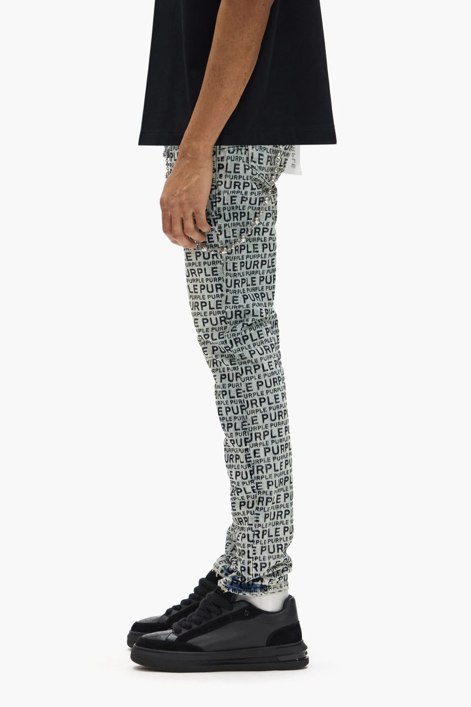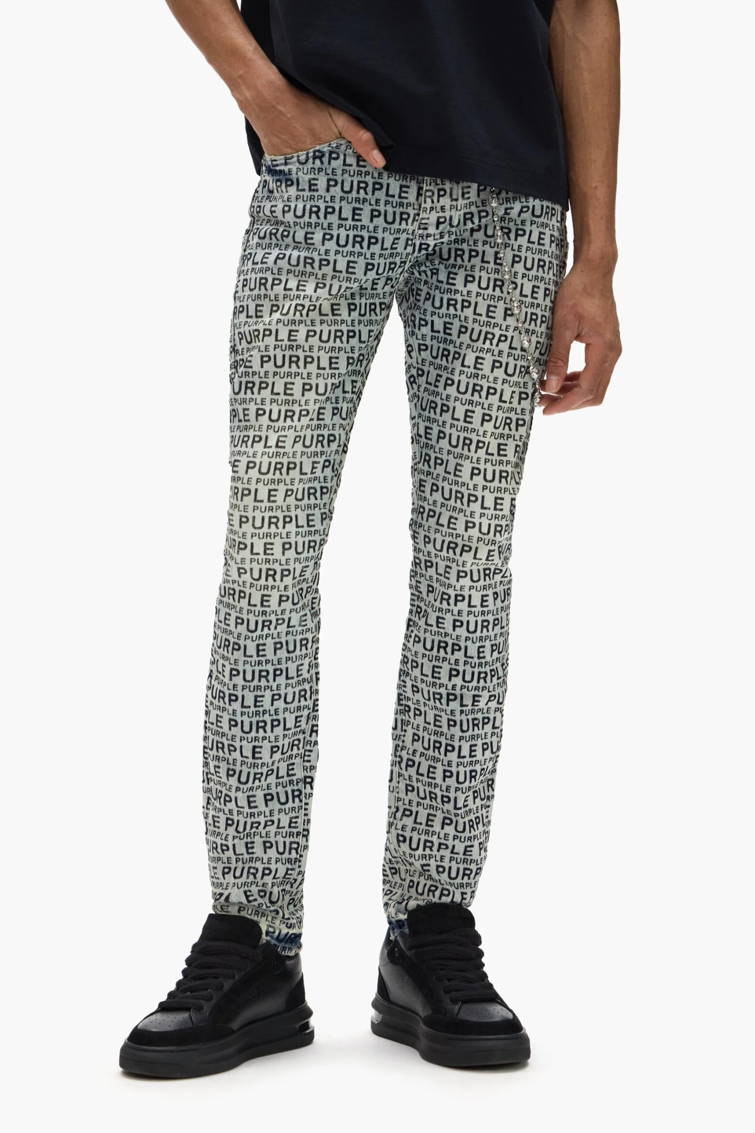 Crafted from premium stretch denim in a light indigo wash, this low rise skinny has an all over flocked Purple Brand wordmark design.
