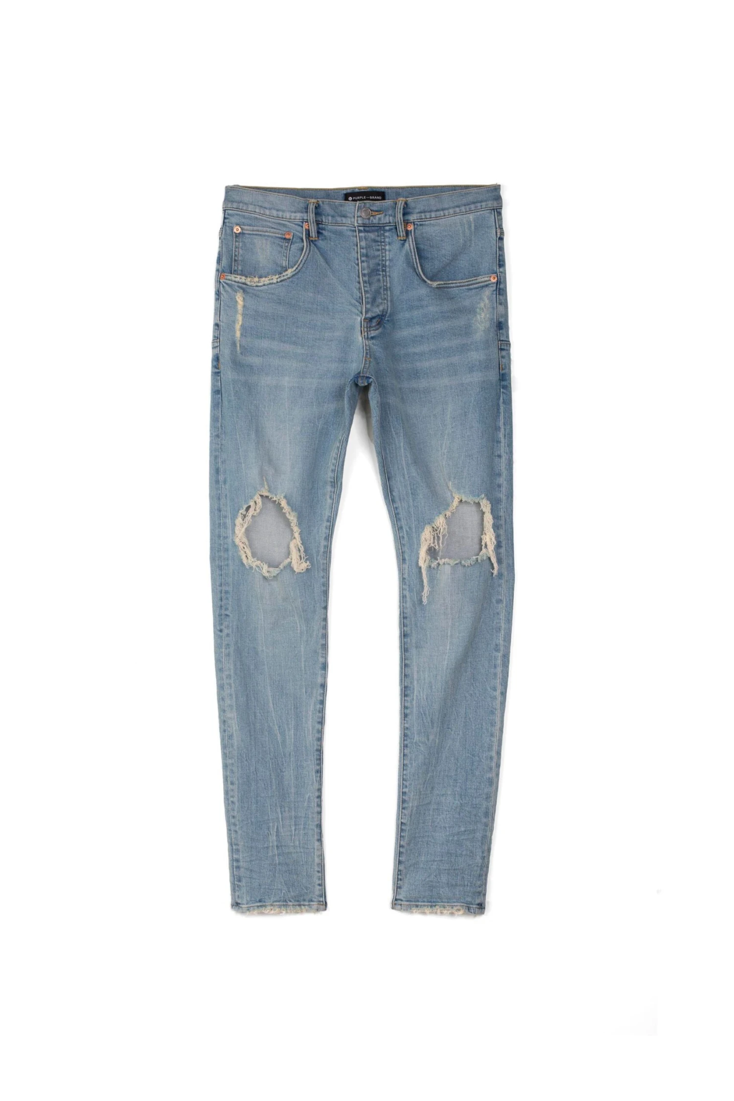 Constructed in a light indigo wash, this elevated denim is designed with blowout detailing at the knees, light abrasion at the pockets and hem for a naturally worn-in feel.