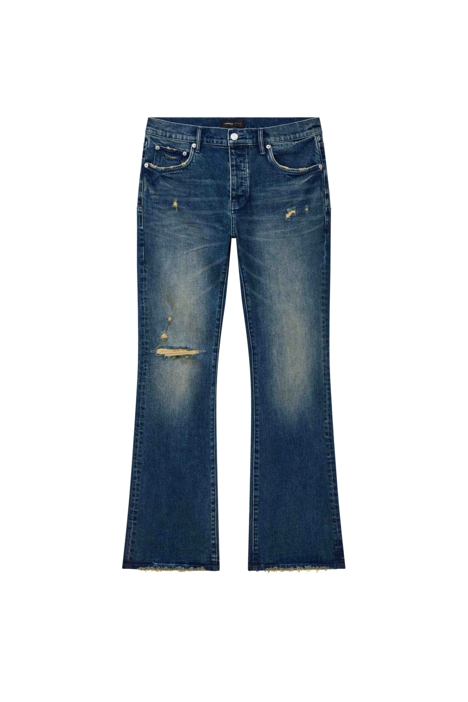 Our P004 is a low-rise flared men’s jean, crafted from premium stretch denim with classic five-pocket construction that includes a button-fly closure and reinforced belt loops as well as hidden rivets and an inner lining on the back pockets for durability. It’s fitted through the thigh and widens to a flared hem, in a medium indigo wash with hand-fading and distressing. A custom Purple cowhide leather patch, a back pocket flasher and a logo hangtag lend signature branded finishes.