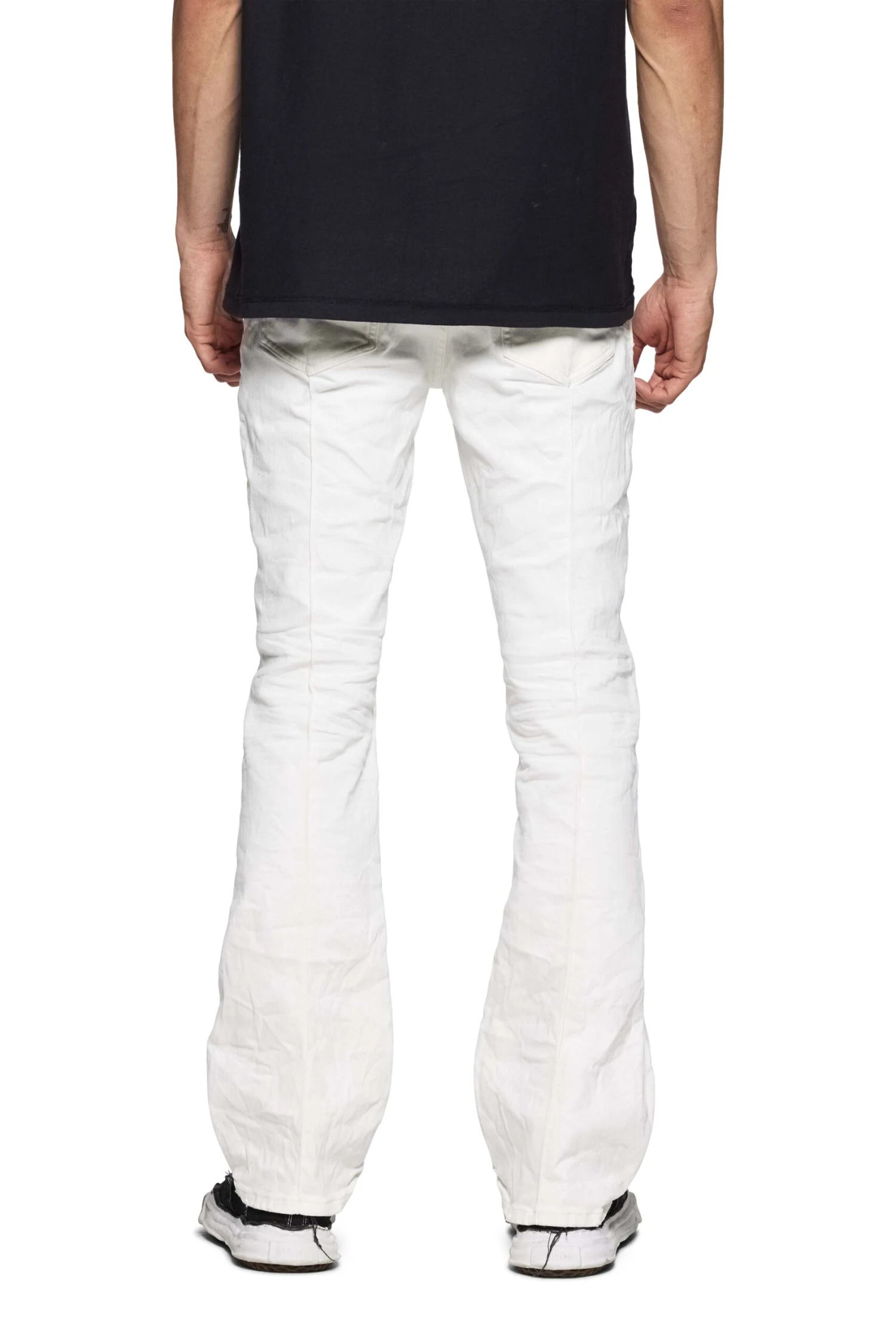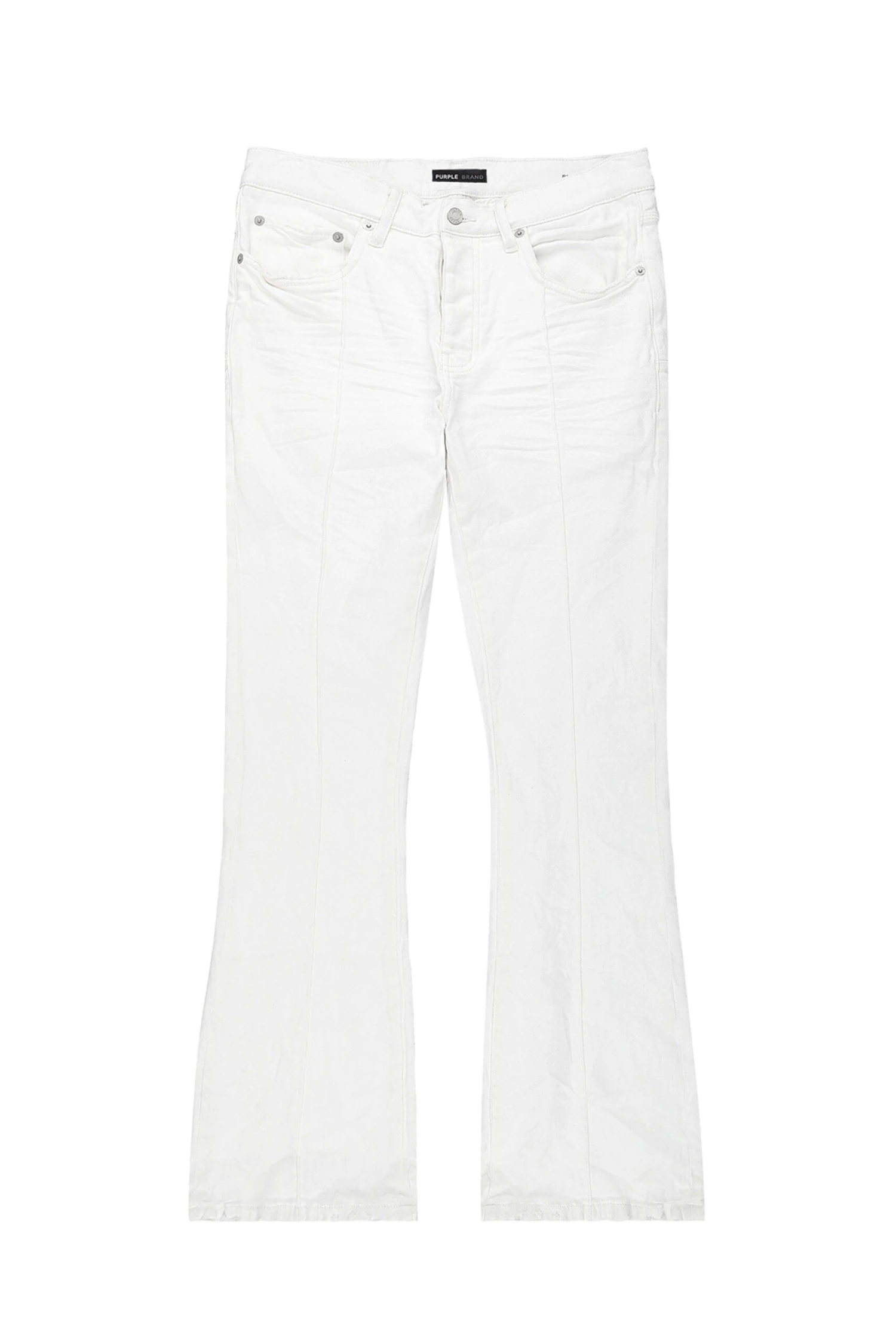 Crafted from premium stretch denim in a white wash, this faded, low rise flare has pintucked center seams.