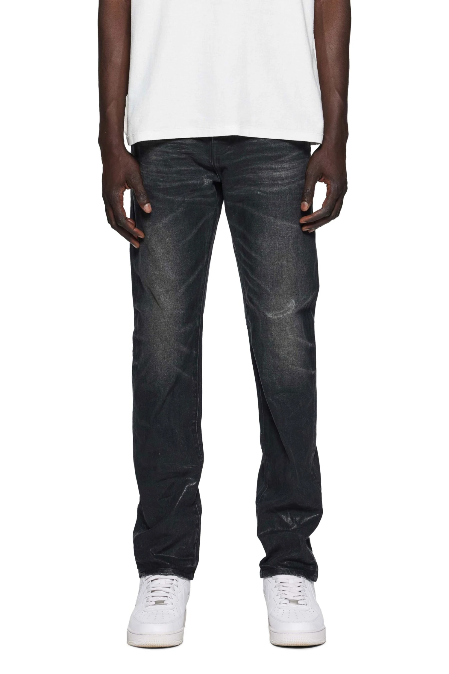 Constructed from black premium stretch denim, this mid rise slim straight leg is coated and detailed by hand.