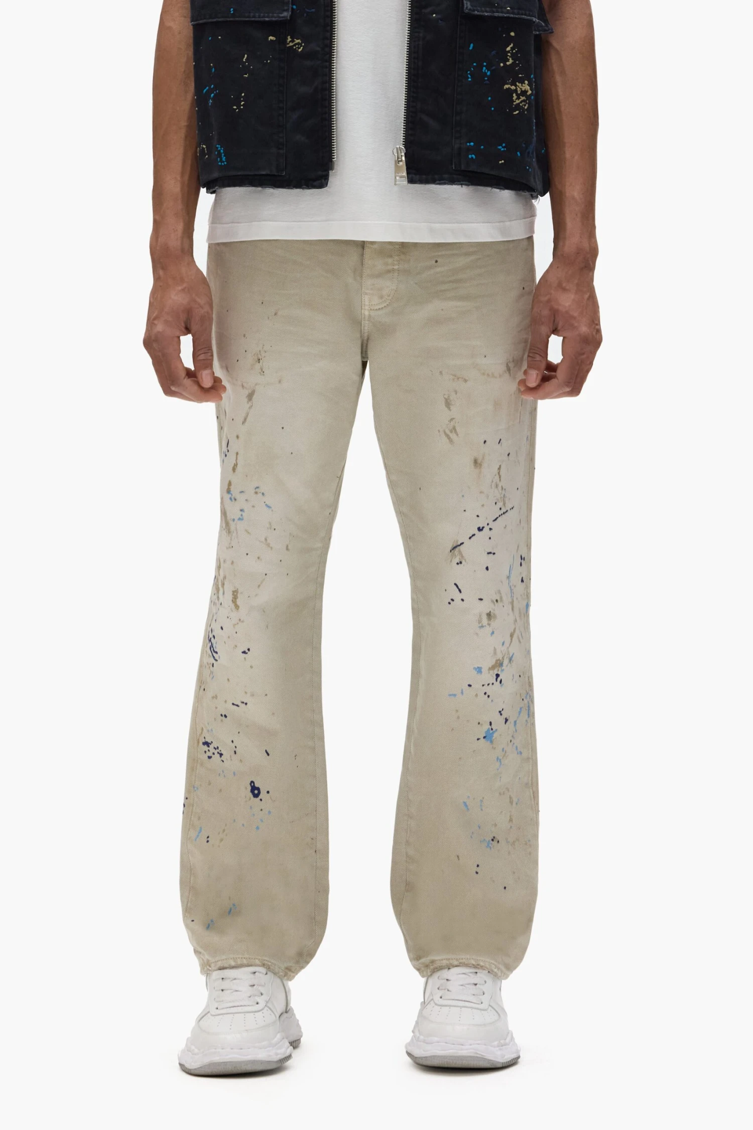 Our P011 is a mid-rise men’s jean, crafted from premium denim with classic five-pocket construction that includes a button-fly closure and reinforced belt loops as well as hidden rivets and an inner lining on the back pockets for durability. It’s cut straight through the thigh to the ankle, and comes overdyed in a khaki wash with paint-splatter embroidery. A custom Purple cowhide leather patch, a back pocket flasher and a logo hangtag lend signature branded finishes.
