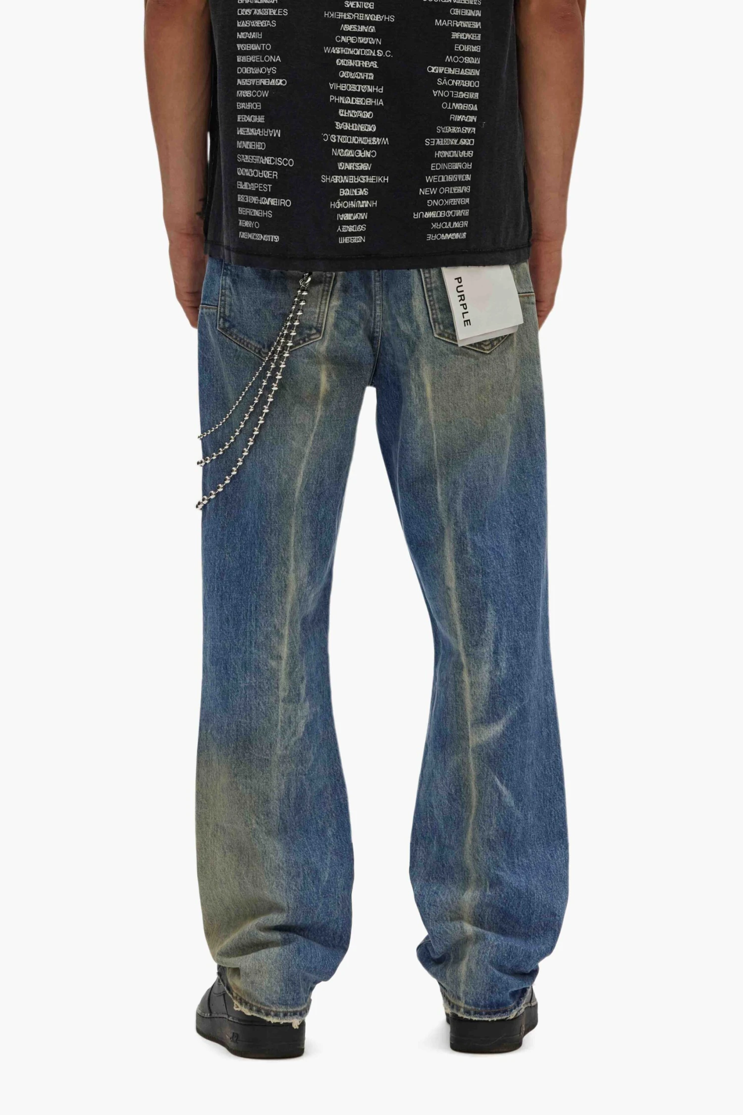 Our P011 is a mid-rise men’s jean, crafted from premium cotton denim with classic five-pocket construction that includes a button-fly closure and reinforced belt loops as well as hidden rivets and an inner lining on the back pockets for durability. It’s cut loose straight fit and comes in a mid indigo wash, with blowouts on both knees. A custom Purple cowhide leather patch, a back pocket flasher and a logo hangtag lend signature branded finishes.
