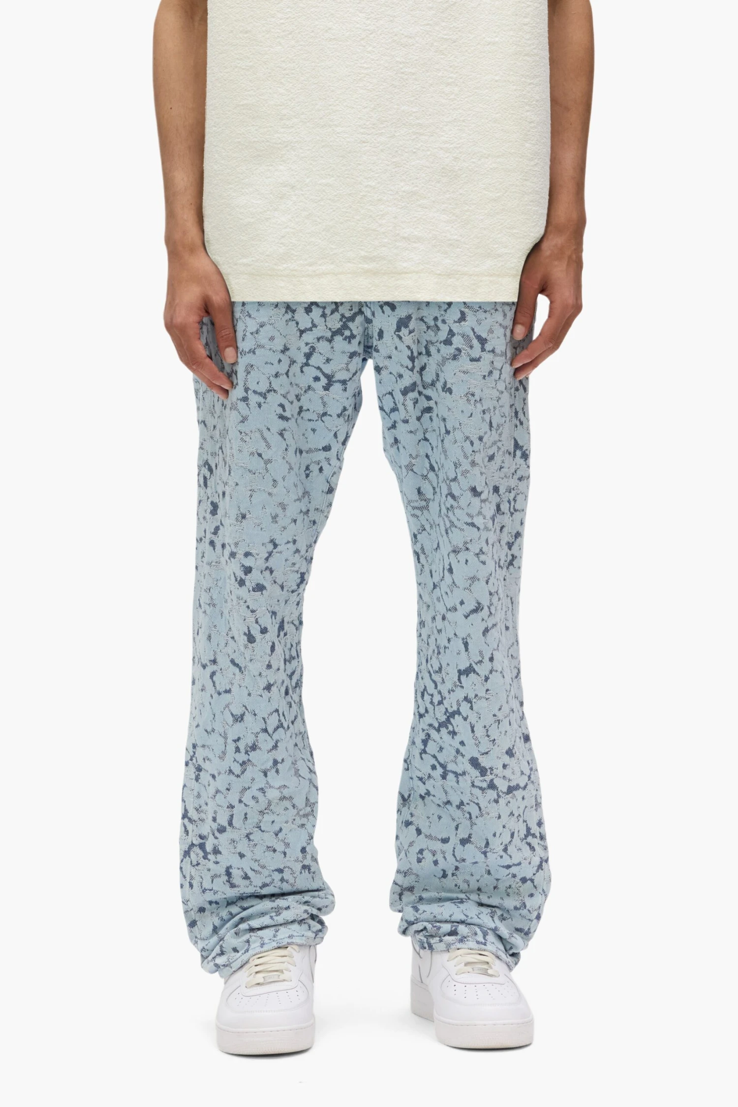 Our P011 is a mid-rise men’s jean, crafted from premium cotton denim with classic five-pocket construction that includes a button-fly closure and reinforced belt loops as well as hidden rivets and an inner lining on the back pockets for durability. It’s cut loose straight fit and comes in a light indigo wash, with an all over leopard jacquard print. A custom Purple cowhide leather patch, a back pocket flasher and a logo hangtag lend signature branded finishes.