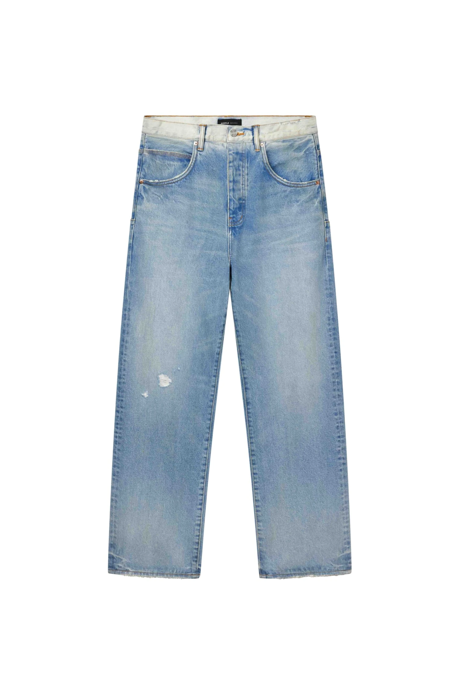 Our P018 is a mid-rise men’s jean, crafted from premium cotton denim with classic five-pocket construction that includes a button-fly closure and reinforced belt loops as well as hidden rivets and an inner lining on the back pockets for durability. It’s cut loose for a baggy fit and comes in a light indigo wash, with hand-fading and distressing. A custom Purple cowhide leather patch, a back pocket flasher and a logo hangtag lend signature branded finishes.