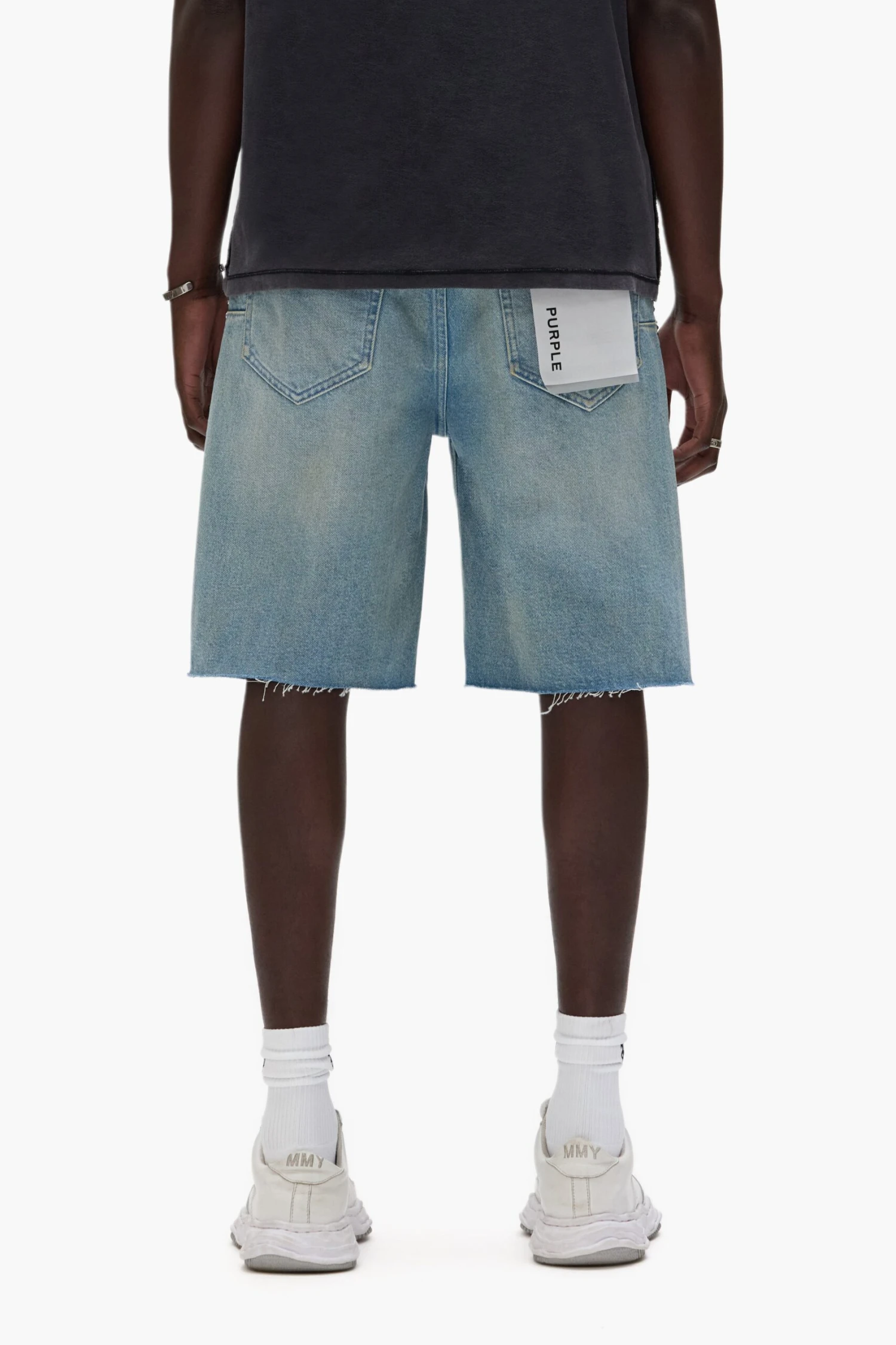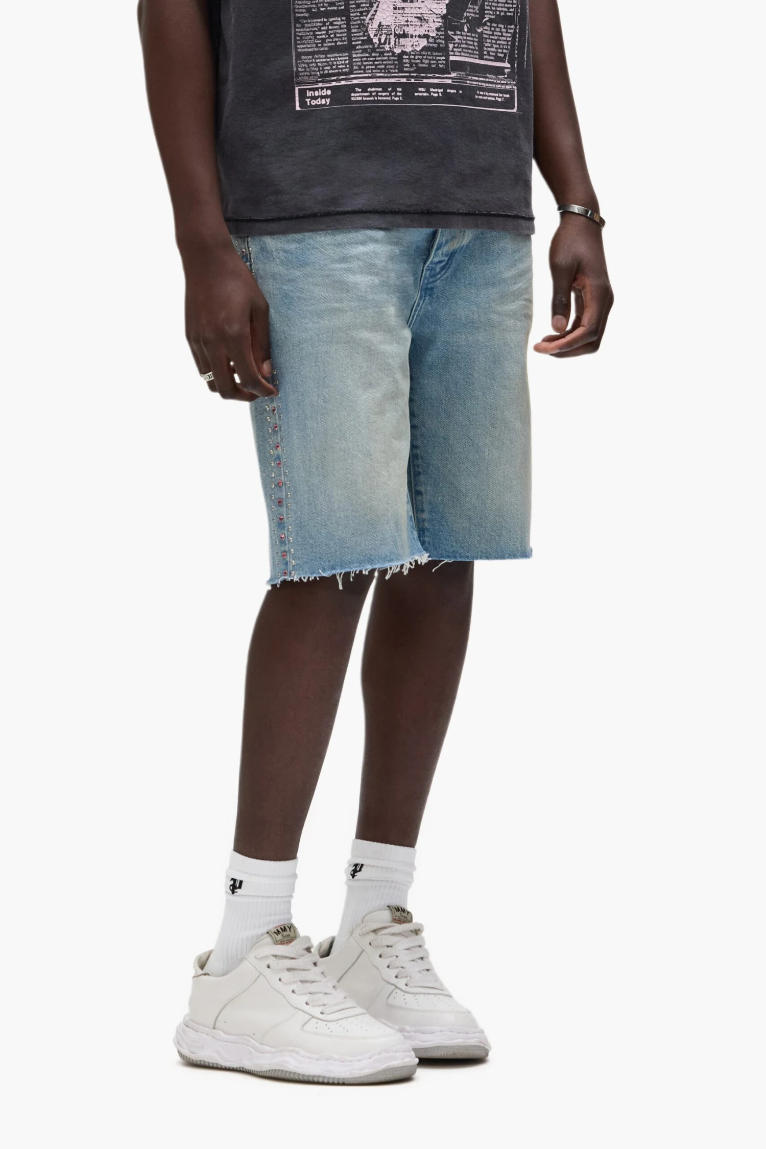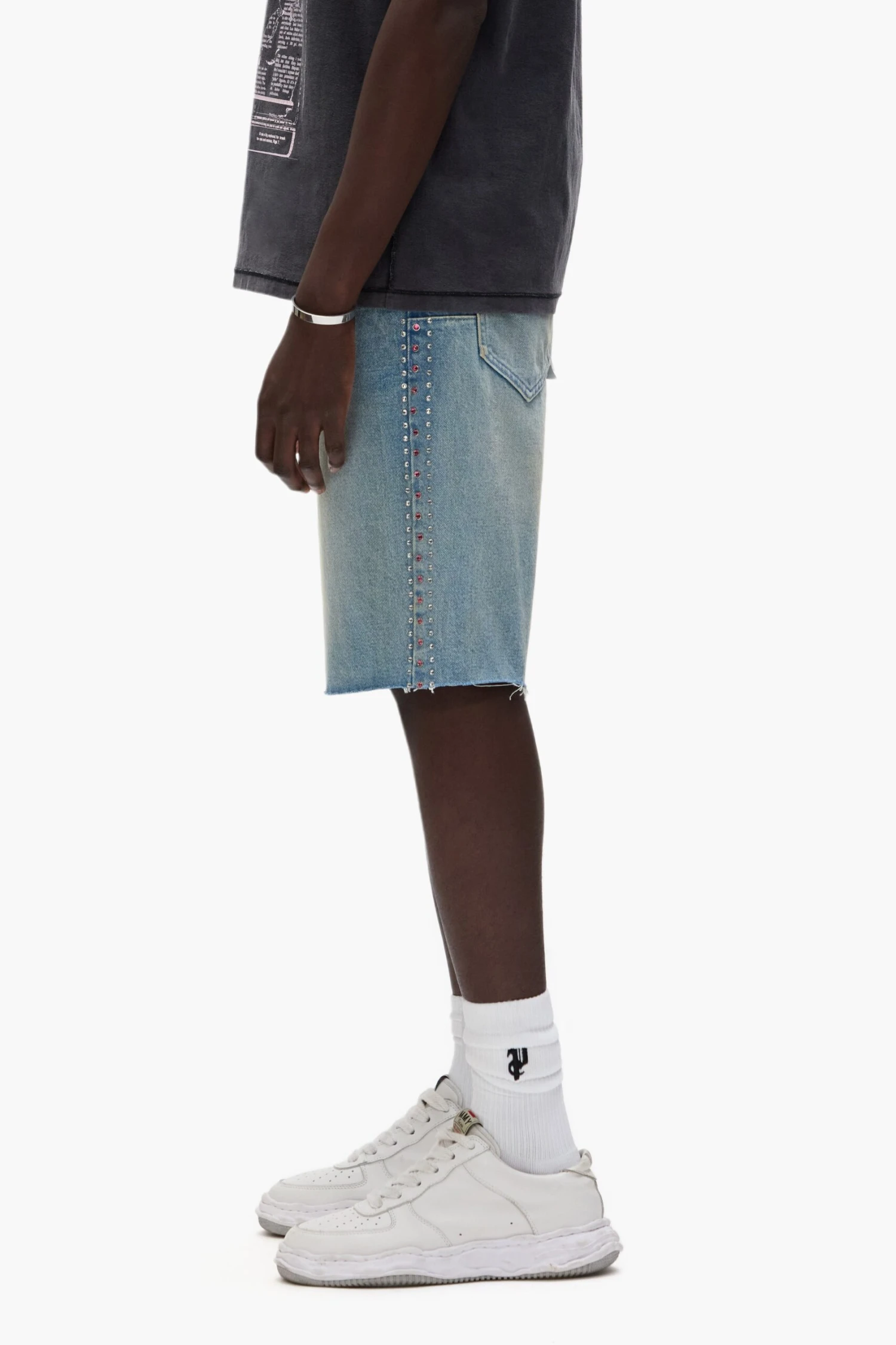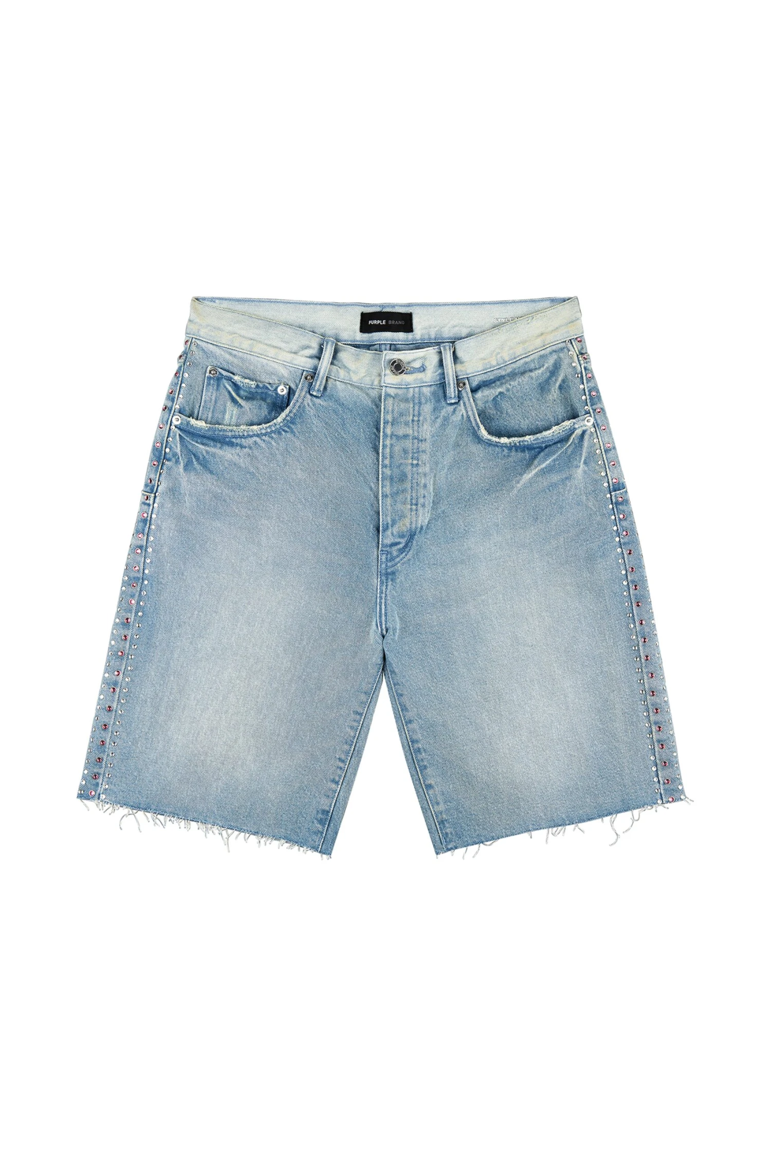 Crafted from light indigo premium stretch denim, these shorts three row crystals on the side seams. The style is detailed with reinforced belt loops and hidden back-pocket rivets for extra durability, cotton lining for a more comfortable fit, bar-tack stitching, a custom Purple cowhide leather patch and signature hang tag branding.