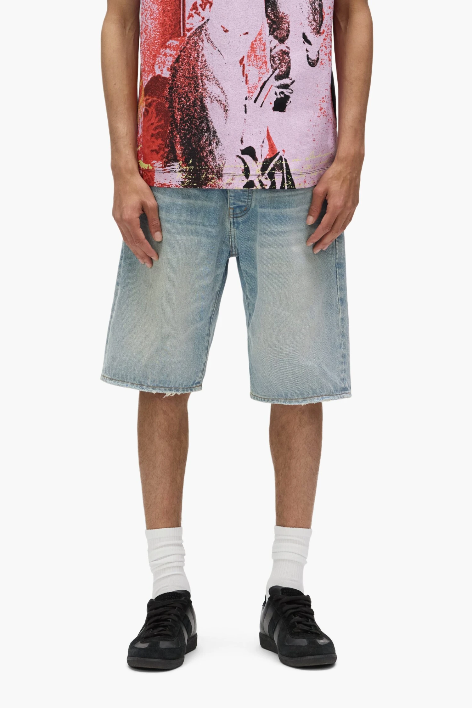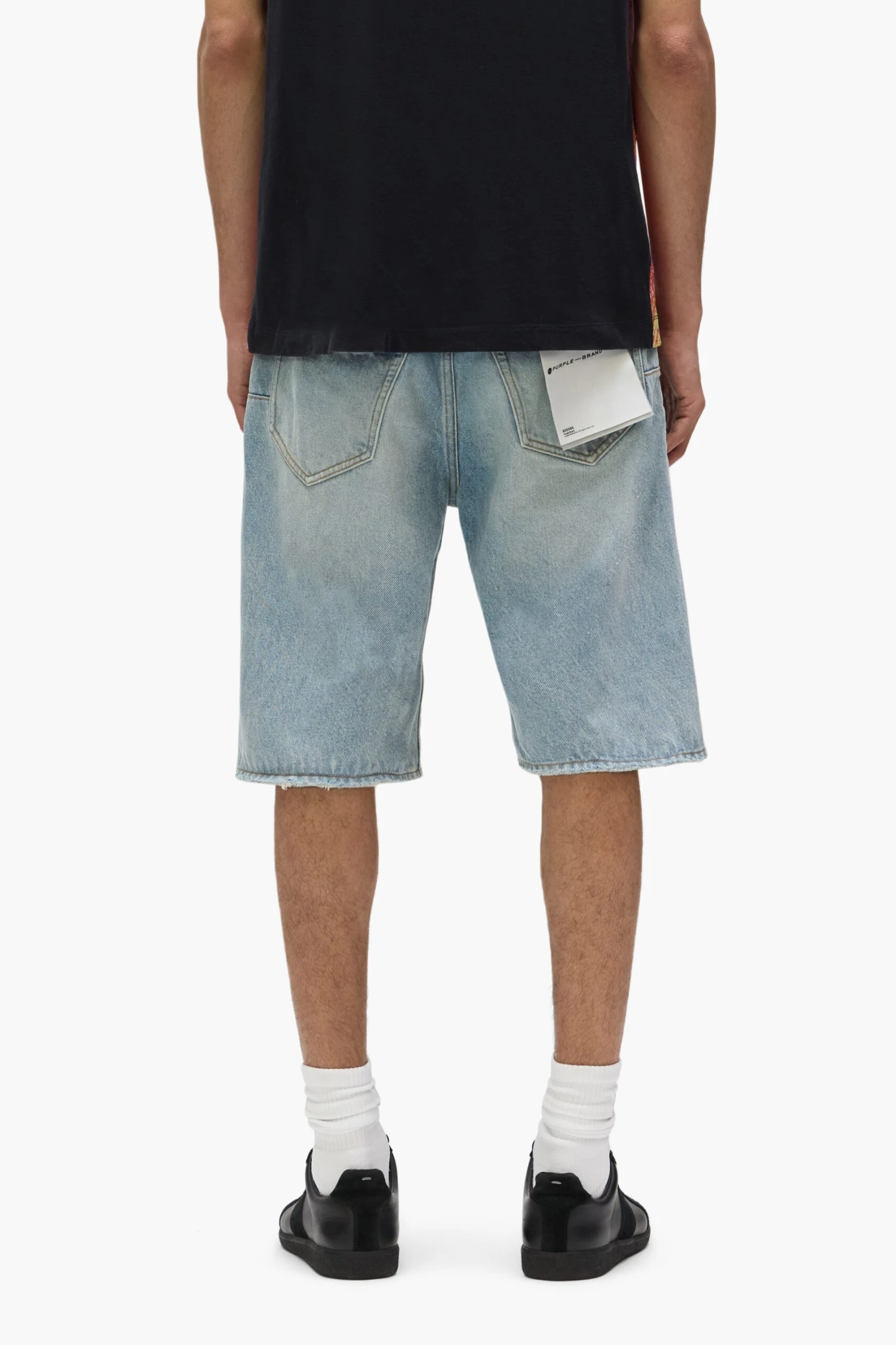 Crafted from premium cotton denim, these P059 shorts feature classic five-pocket construction that includes a button-fly closure and reinforced belt loops as well as hidden rivets and an inner lining on the back pockets for durability. They’re designed for a relaxed fit in a light indigo wash, with hand-fading for a worn effect. A custom Purple cowhide leather patch, a back pocket flasher and a logo hangtag lend signature branded finishes.