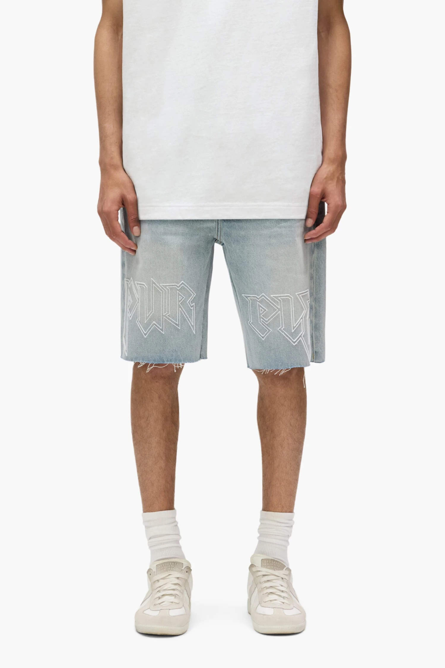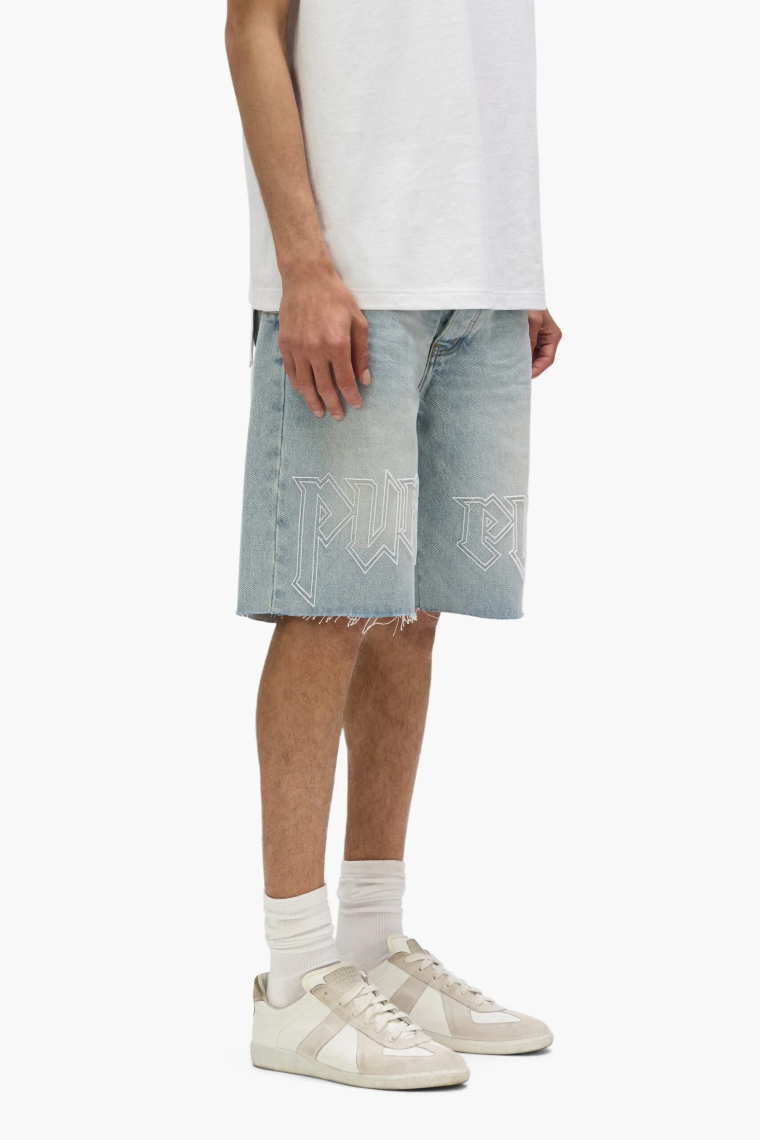 Crafted from premium cotton denim, these P059 shorts feature classic five-pocket construction that includes a button-fly closure and reinforced belt loops as well as hidden rivets and an inner lining on the back pockets for durability. They’re designed for a relaxed fit in a light indigo wash, tuffetage embroidery on the hem of both legs A custom Purple cowhide leather patch, a back pocket flasher and a logo hangtag lend signature branded finishes.