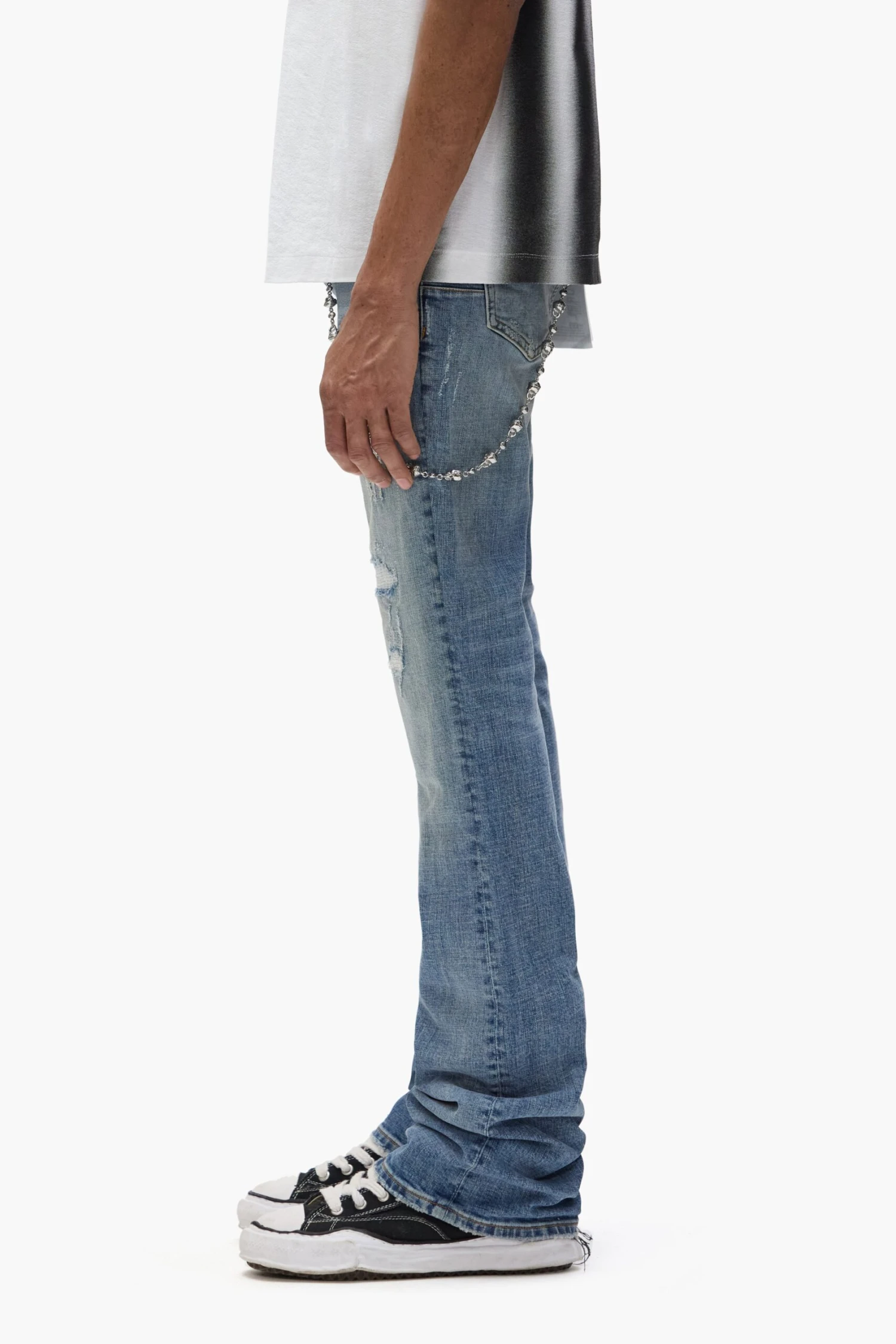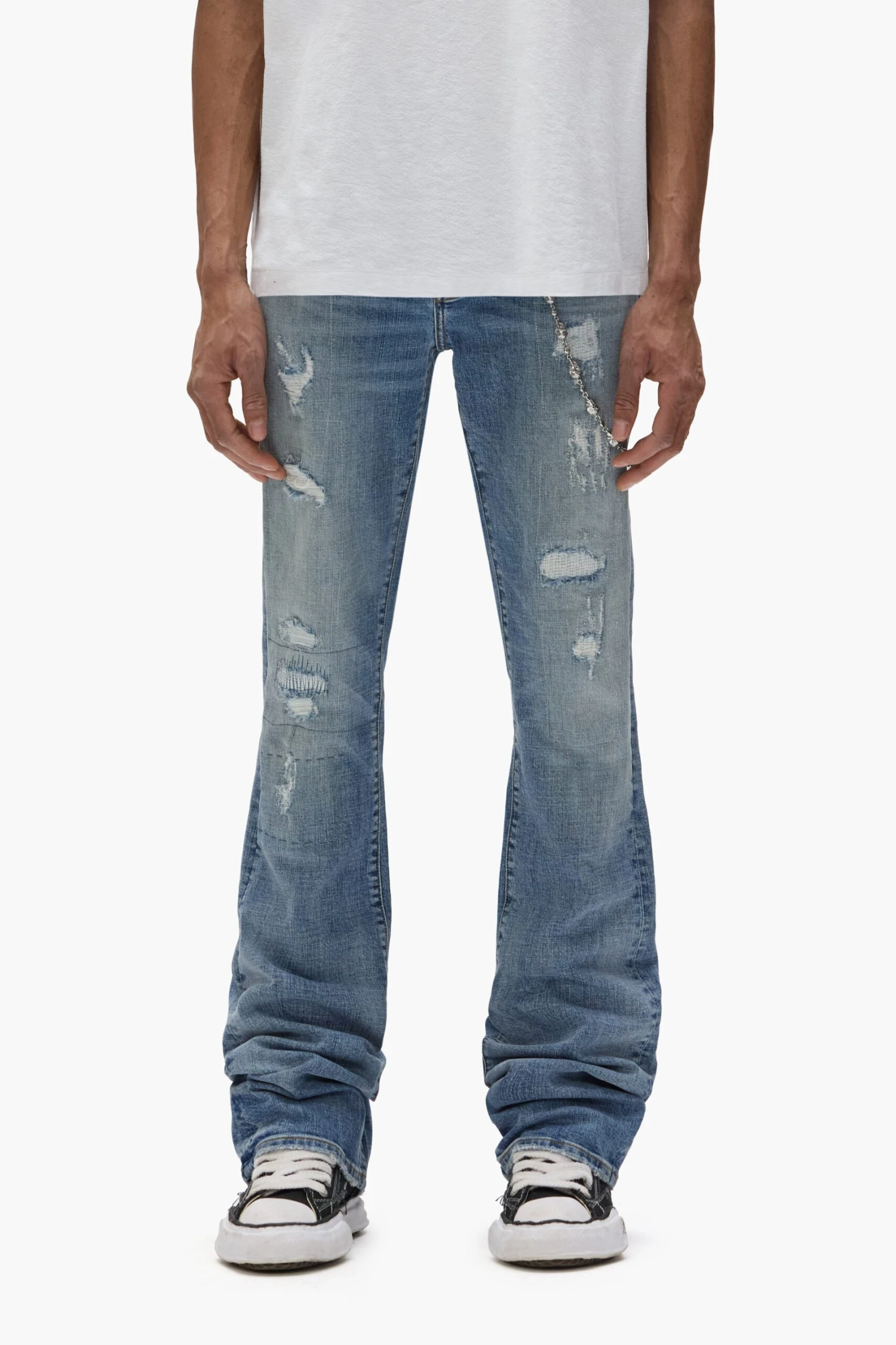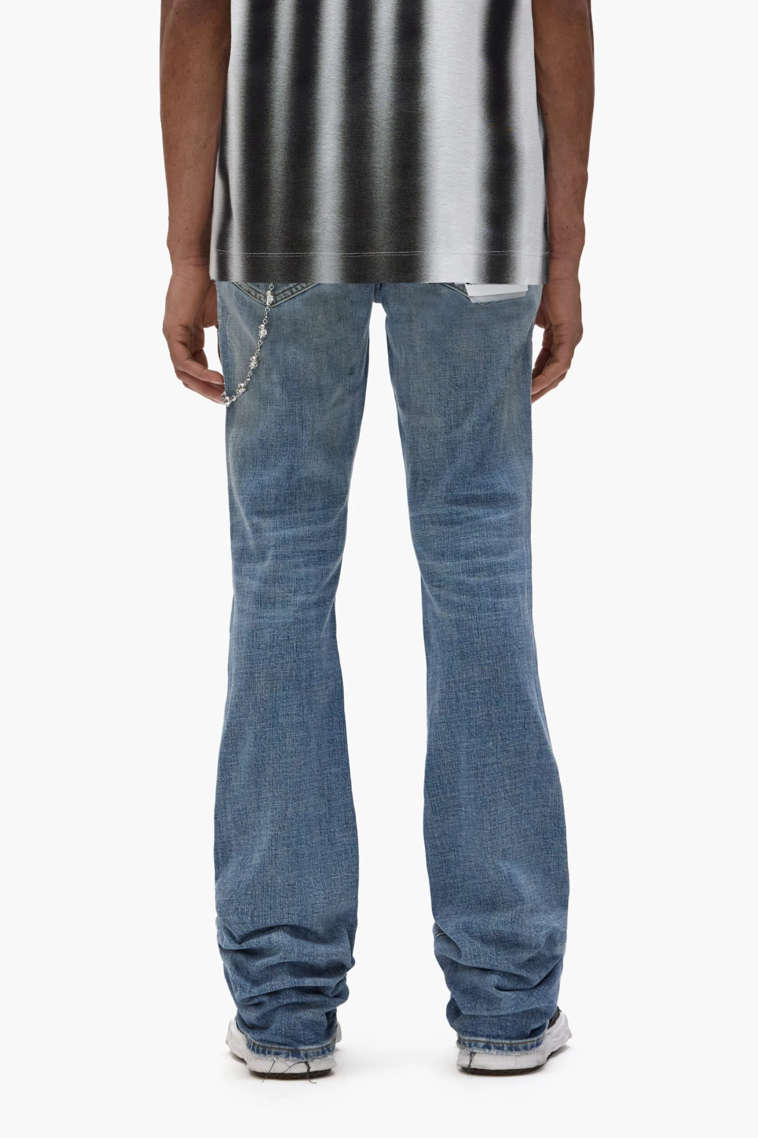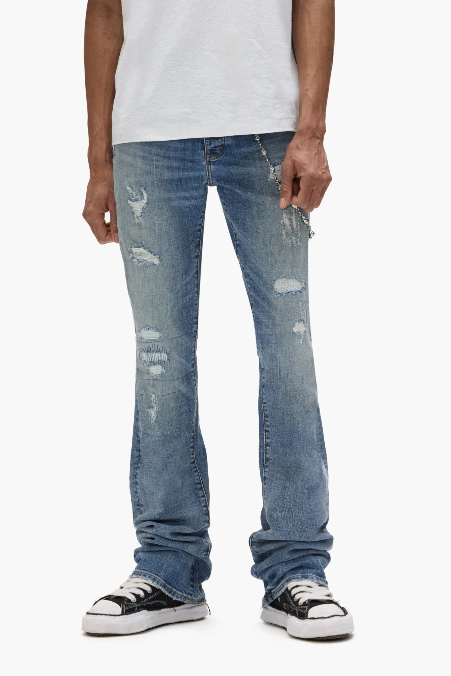 Our P072 is a low-rise men’s jean, crafted from premium stretch denim with classic five-pocket construction that includes a button-fly closure and reinforced belt loops as well as hidden rivets and an inner lining on the back pockets for durability. It’s cut slim through the thigh with an extra-long flared hem and comes in a light indigo wash, with rip-and-repair distressing. A custom Purple cowhide leather patch, a back pocket flasher and a logo hangtag lend signature branded finishes.