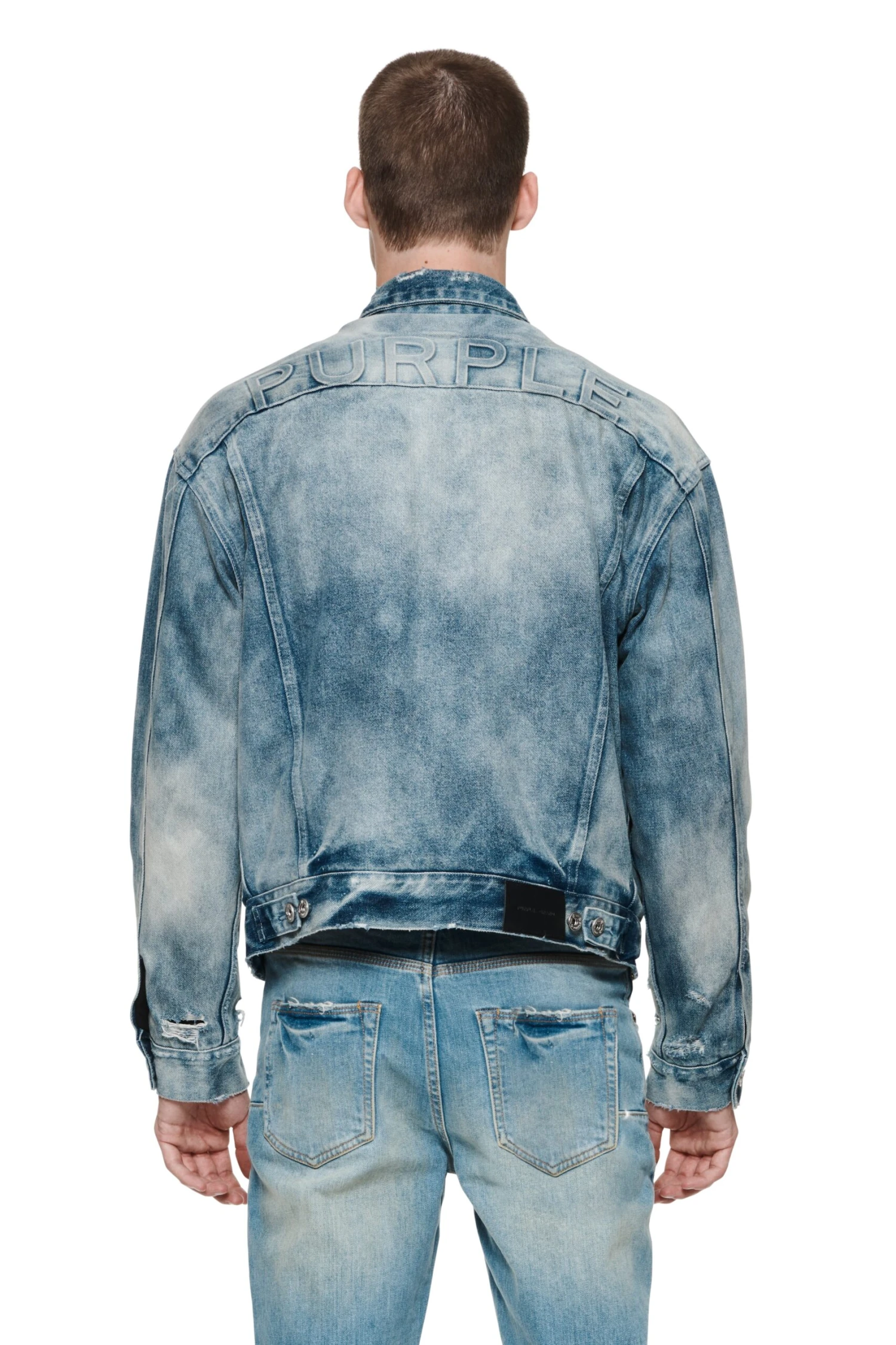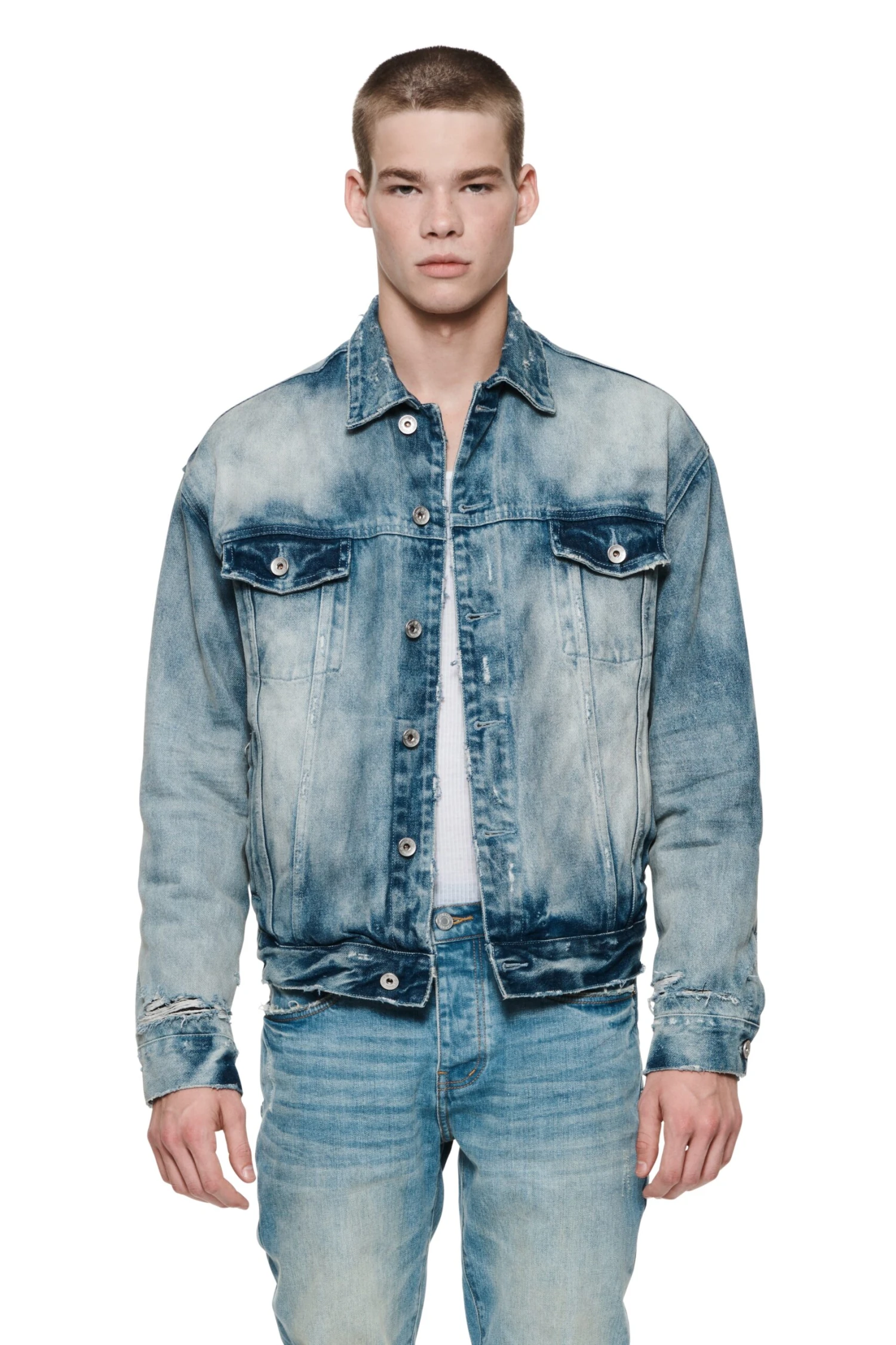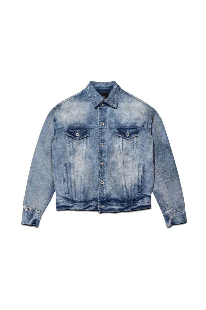 Made of premium denim in a medium indigo wash with fading, this jacket is a classic trucker style insulated with padding. It features double flap pockets at the chest as well as double side pockets.