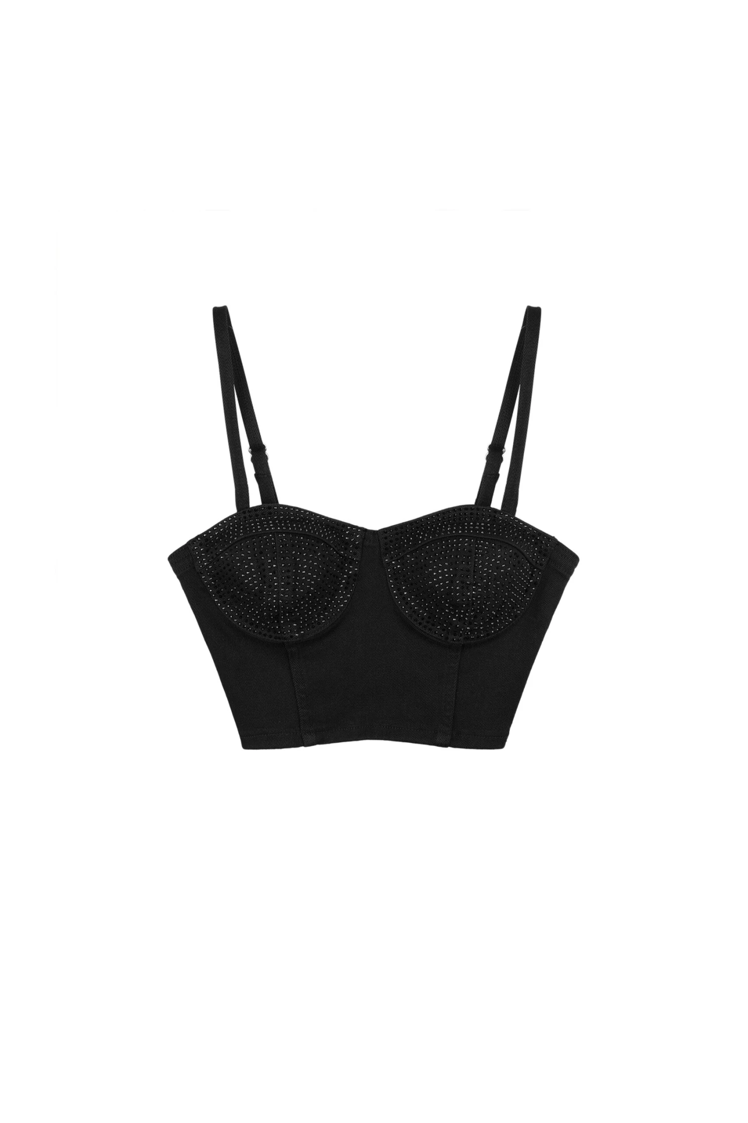 This rhinestone corsette features adjustable straps, lined cups and an exposed zipper closure.