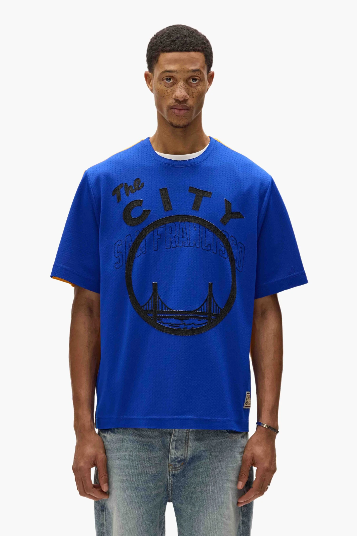 Bold graphics and elevated fabrics for a casual yet sophisticated feel. This oversized tee is cut from 100% polyester sport mesh with a raw edge finish at the neck & hem.