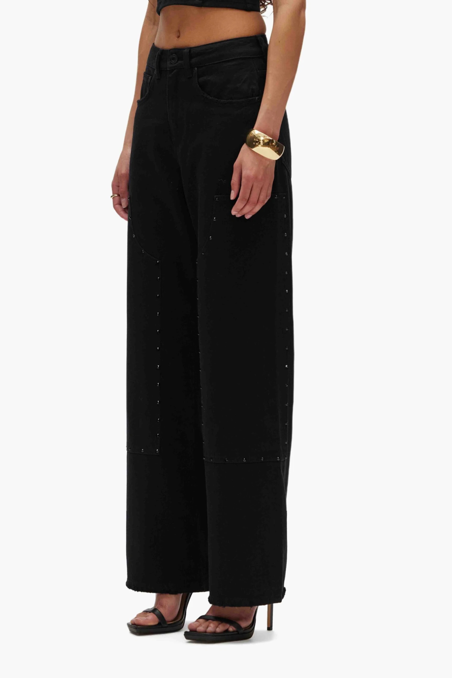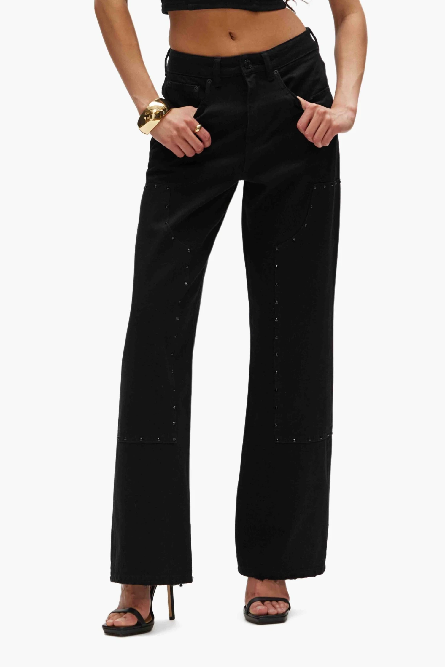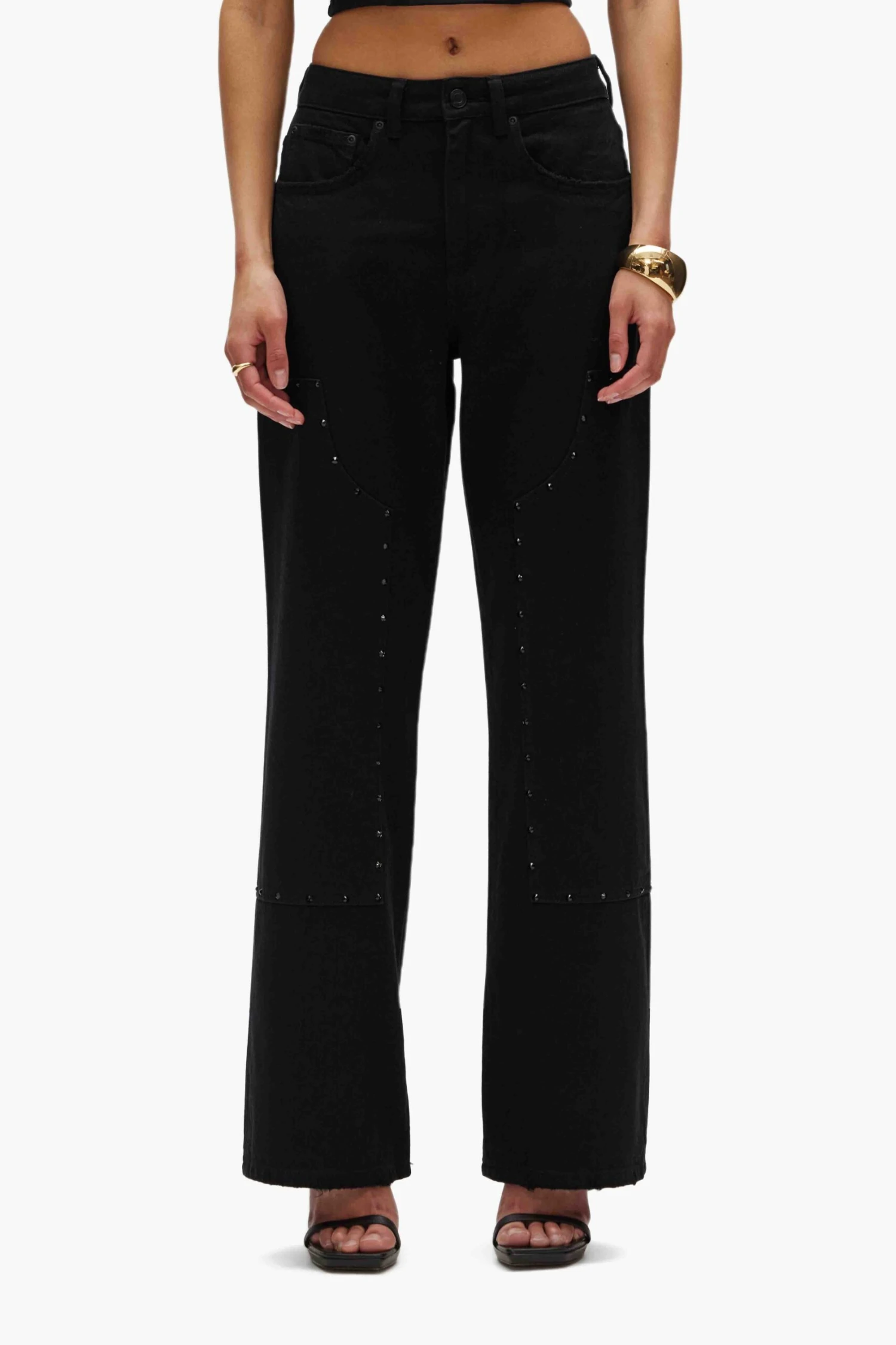 These jeans are classically detailed with double knee panels outlined with rhinestones, a hammer loop, reinforced belt loops, bar-tack stitching for extra durability, and a custom Purple cowhide leather patch.