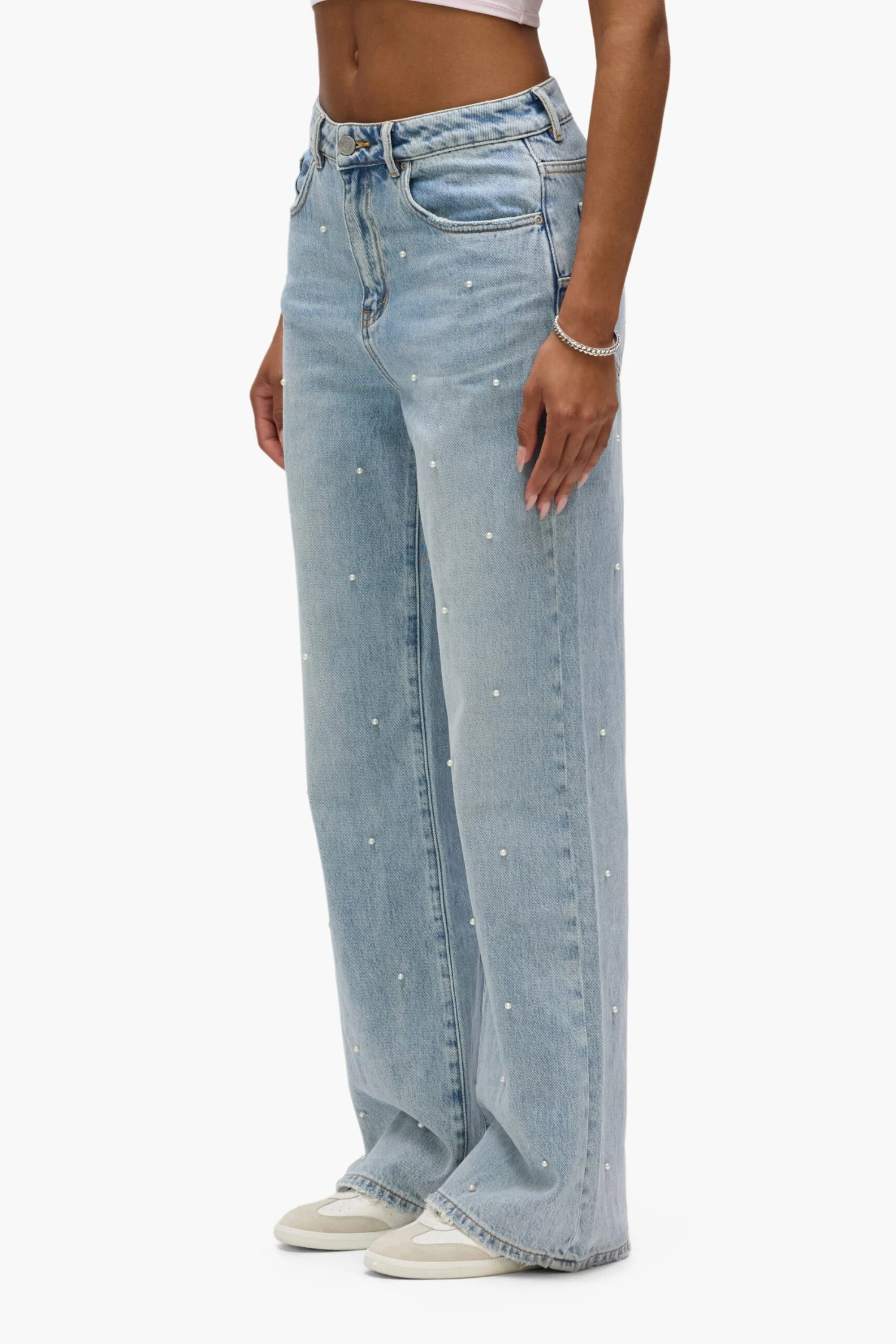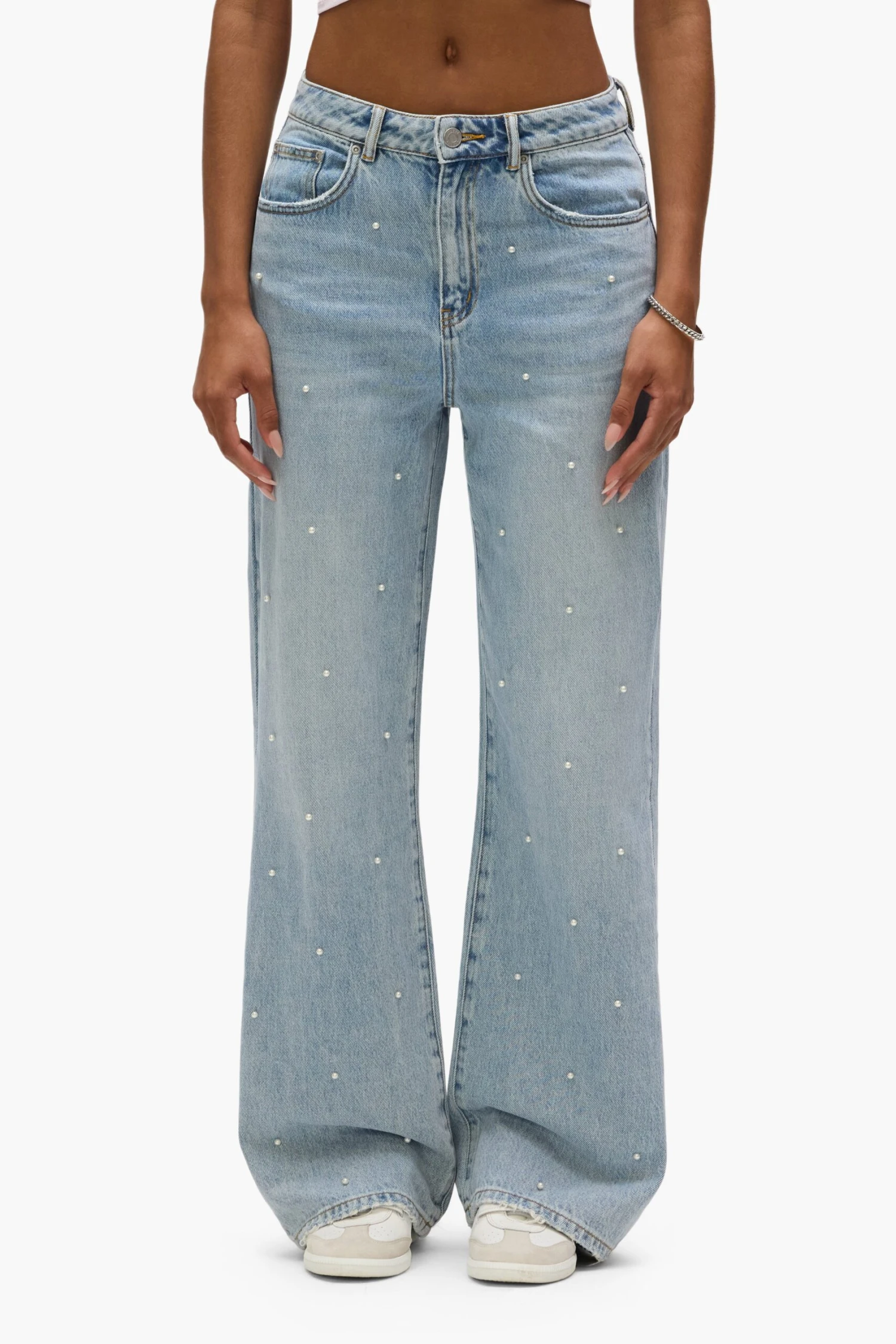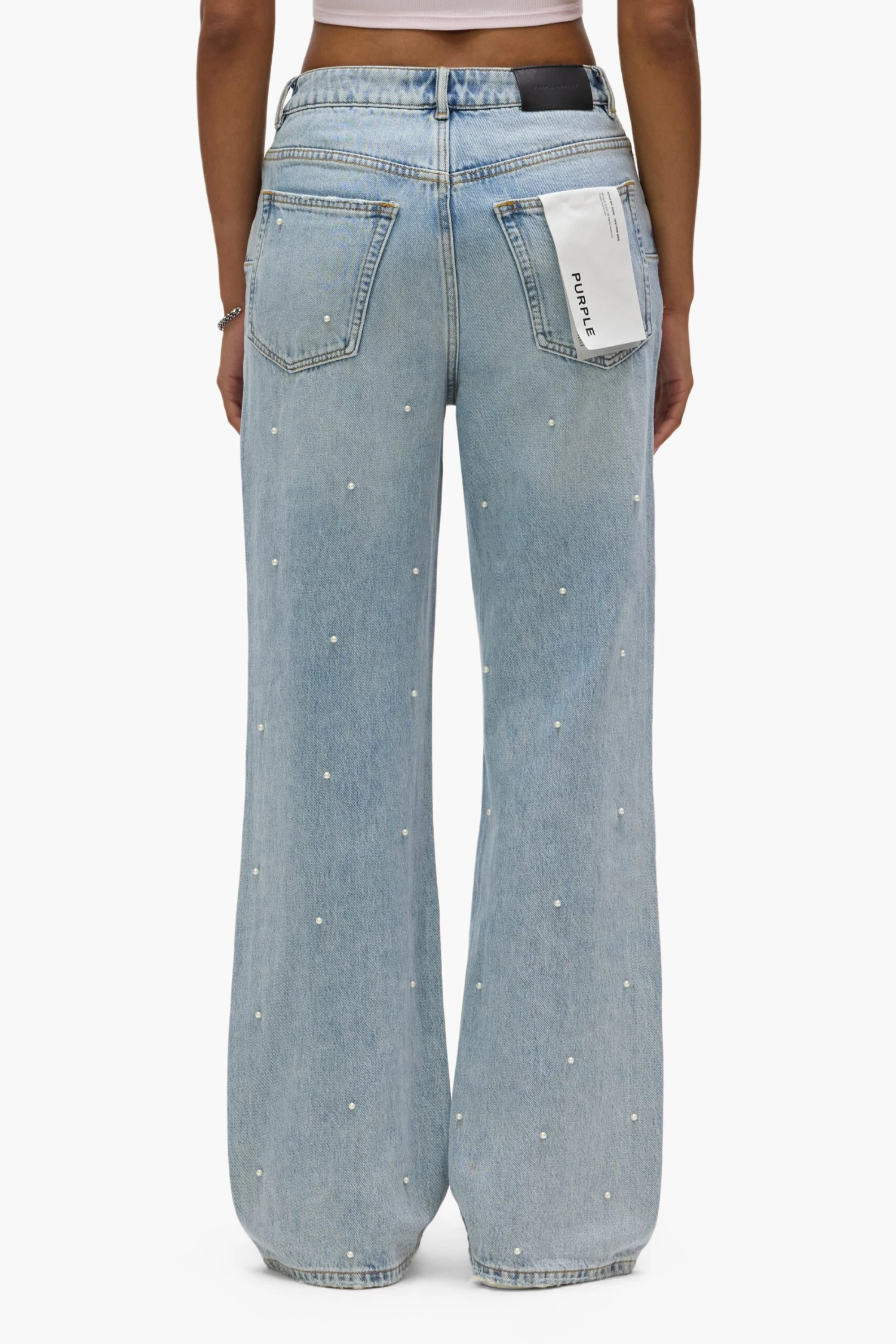 Crafted from premium light indigo denim with all over hotfix pearls, this high-rise is cut with a wide, relaxed leg. It features five pocket styling, reinforced belt loops, bar-tack stitching, chambray lining for a more comfortable fit, a custom Purple cowhide leather patch and signature hangtag branding.